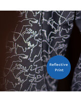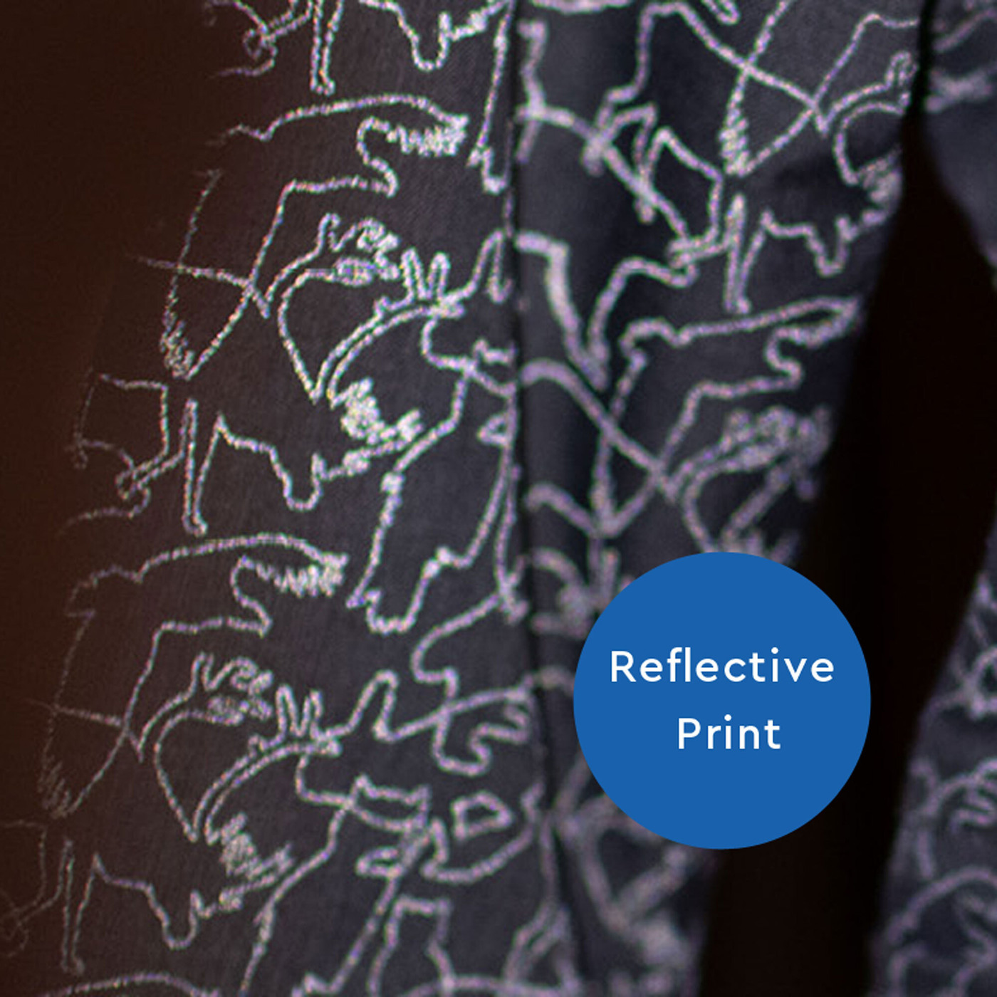 Der Schirm an der Kapuze hält Regen vom Gesicht fern. Für eine bessere Sichtbarkeit im Dunkeln sorgen der reflektierende Animal-Print im Stoff und andere reflektierende Elemente