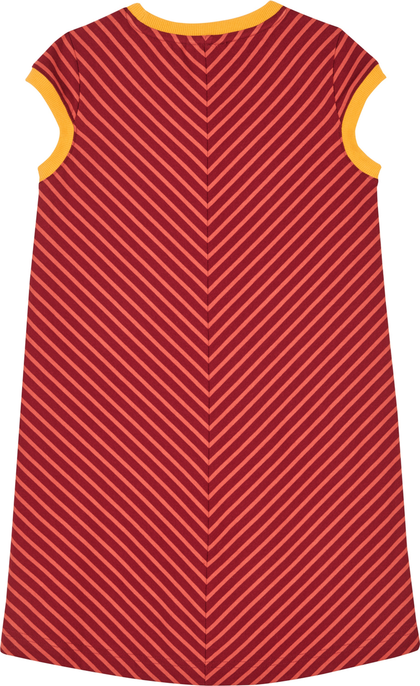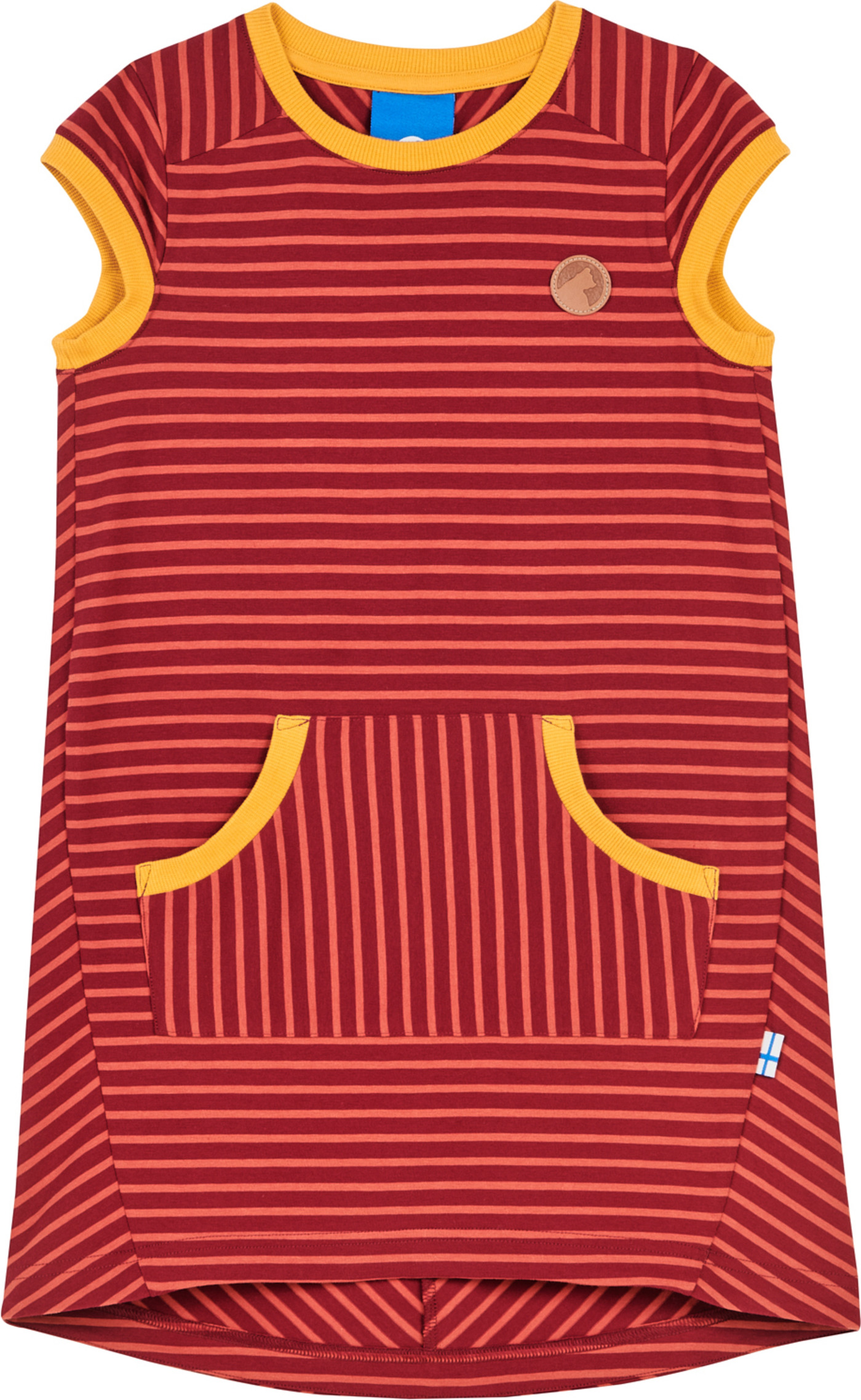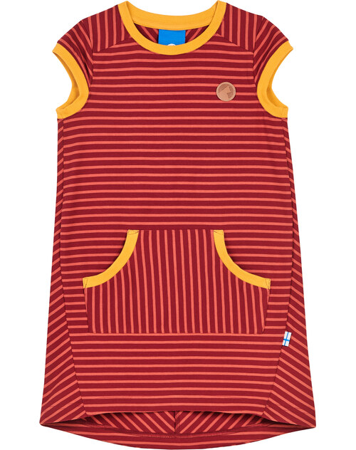 Gestreiftes Kurzarm-Kleid Keidas von FINKID für Mädchen. Die kontrastfarbenen Paspeln am Halsausschnitt und an den Ärmeln geben dem Kleid zusätzlich Pepp. In der aufgesetzten Bauch-Tasche ist Platz für kleine Schätze. Das FINKID-Logo befindet sich auf der linken Brust. Die Rückseite ist etwas länger geschnitten.
