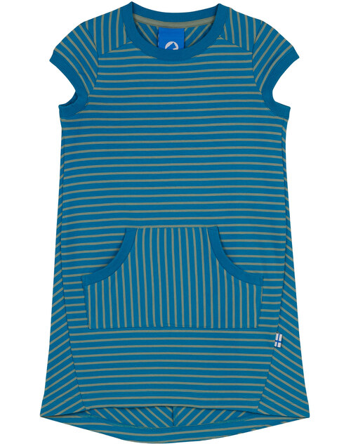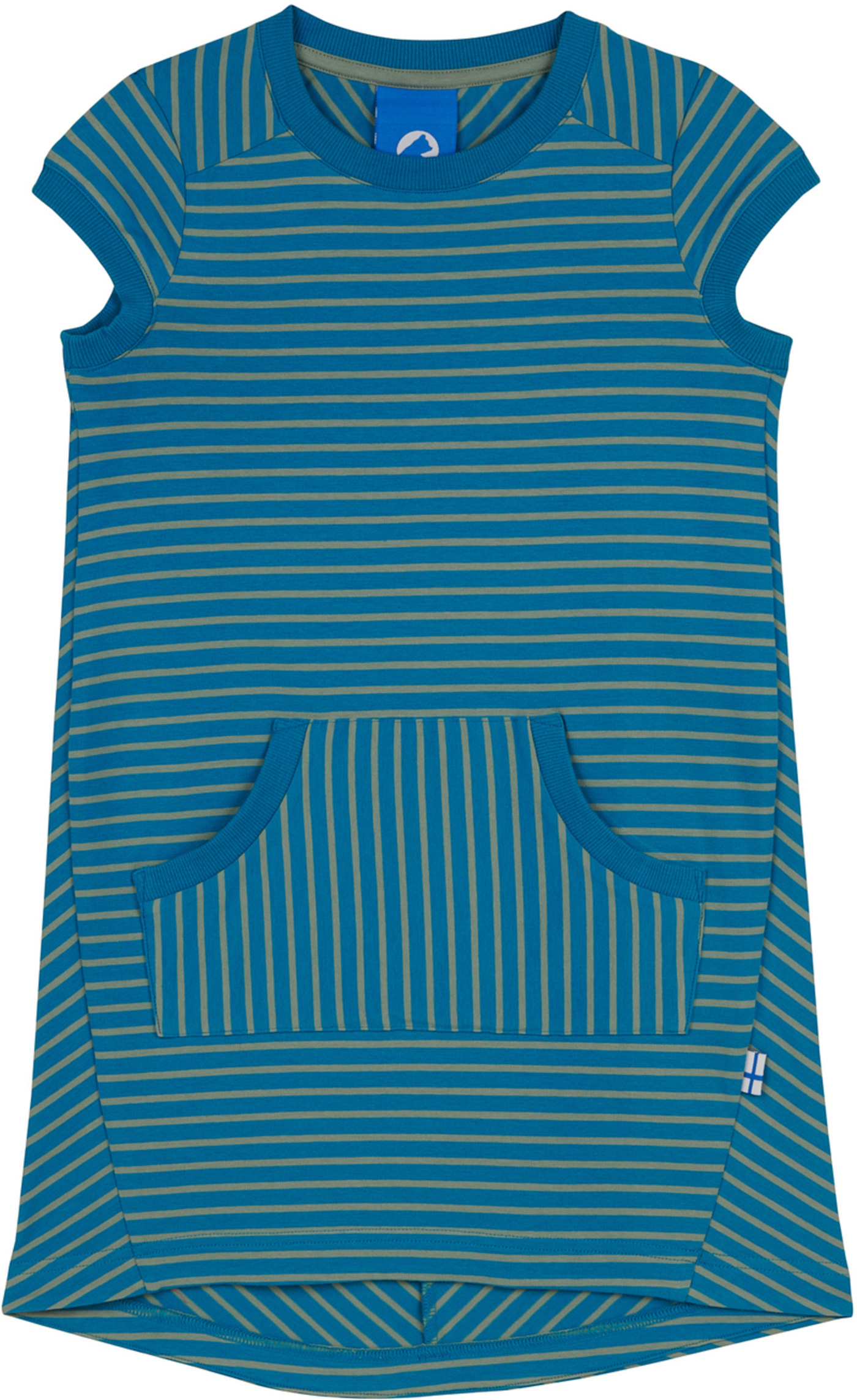 Gestreiftes Kurzarm-Kleid KEIDAS von FINKID. Die kontrastfarbenen Paspeln am Halsausschnitt und an den Ärmeln geben dem Kleid zusätzlich Pepp. In der aufgesetzten Bauch-Tasche ist Platz für kleine Schätze. Die Rückseite ist etwas länger geschnitten.