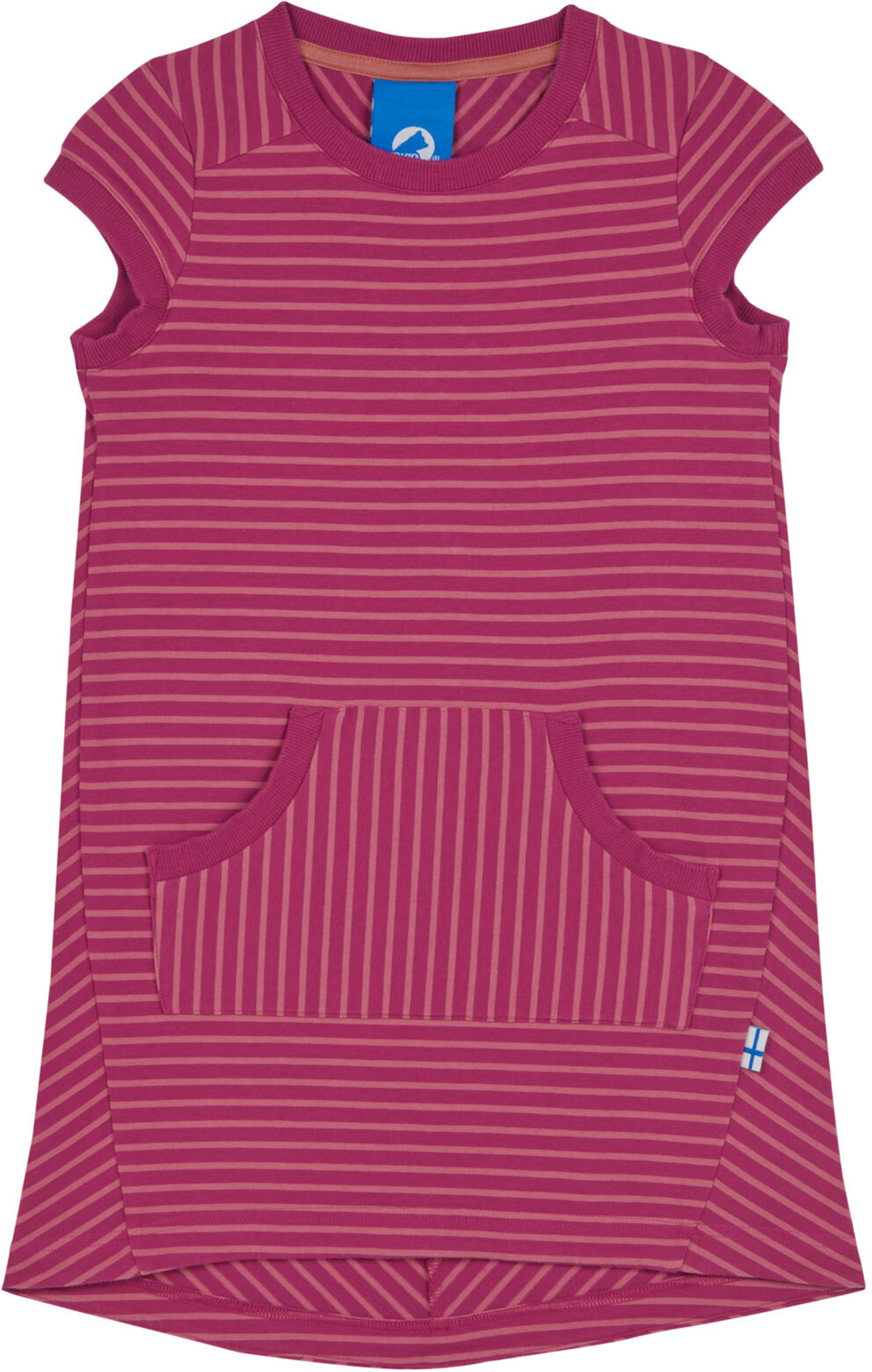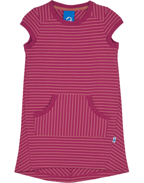 Gestreiftes Kurzarm-Kleid KEIDAS von FINKID. Die kontrastfarbenen Paspeln am Halsausschnitt und an den Ärmeln geben dem Kleid zusätzlich Pepp. In der aufgesetzten Bauch-Tasche ist Platz für kleine Schätze. Die Rückseite ist etwas länger geschnitten.