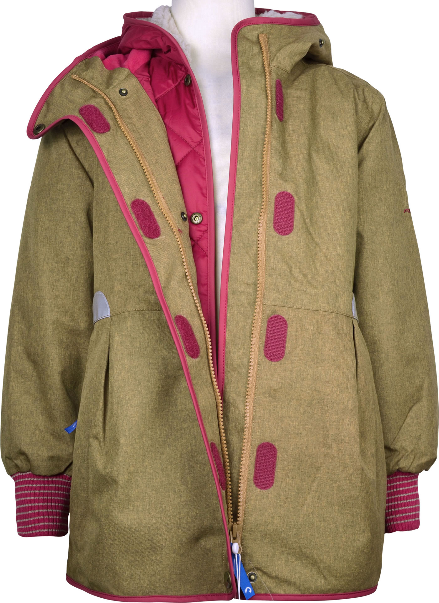 Mit der wasserdichten und schmutzabweisenden 2 in 1 Outdoorjacke AINA ICE von FINKID sind Mädchen vom Herbst bis ins Frühjahr bestens Ausgestattet. Als Übergangsjacke ist die taillierte Jacke mit versiegelten Nähten ein toller Begleiter und an kalten Tagen wärmt das herausnehmbare Innenfutter zusätzlich. Weiche Rippbündchen an den Ärmeln und ein weiches Kapuzenfutter sorgen für einen hohen Tragekomfort. Tolle Details sind die Taschen mit Zipper und reflektierende Elemente, die für eine bessere Sichtbarkeit sorgen.