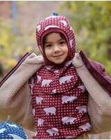Die schöne Schlupfmütze LUOLA NORDIK von Finkid ist eine gemütliche Woll-Schlupfmütze für Kinder mit liebevollem Bärenmuster. 🐻