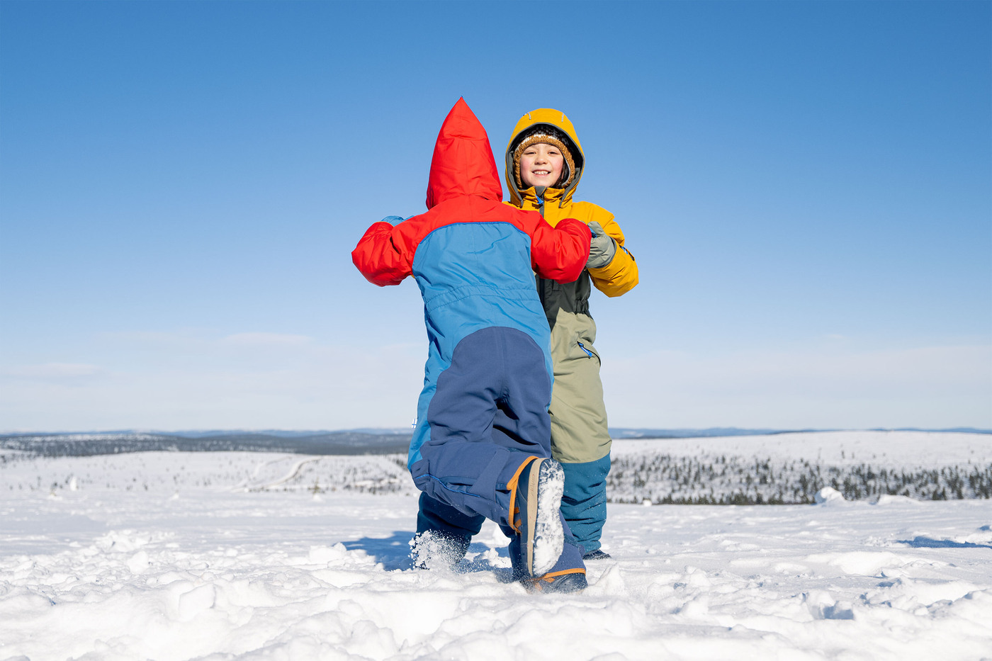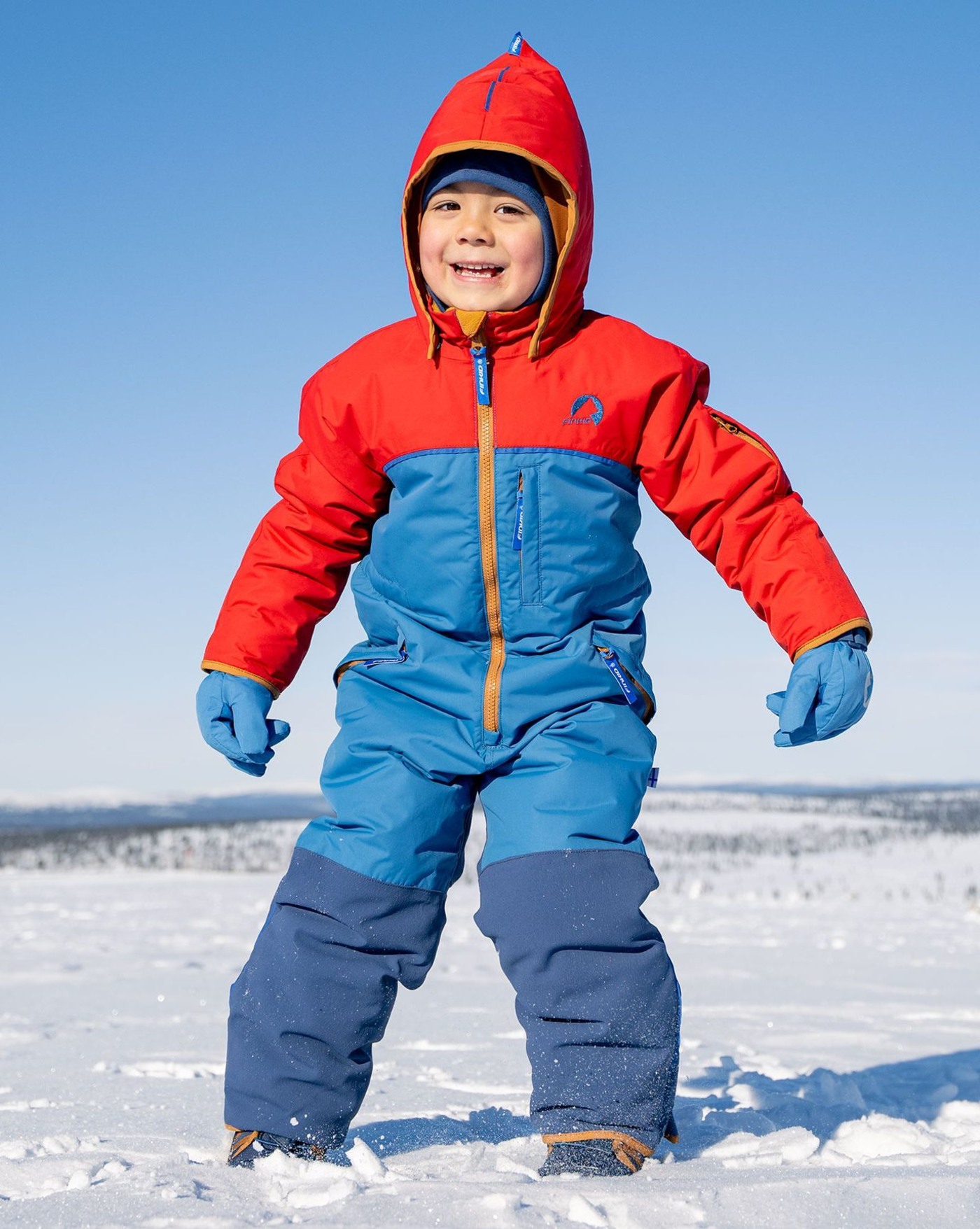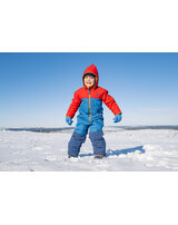 Mit dem wattierten Winteroverall VILKAS SNOW im Colorblocking-Design von Finkid sind Kinder bestens gerüstet für Wintersport und Spielen bei Kälte und Schnee. ⛷️
