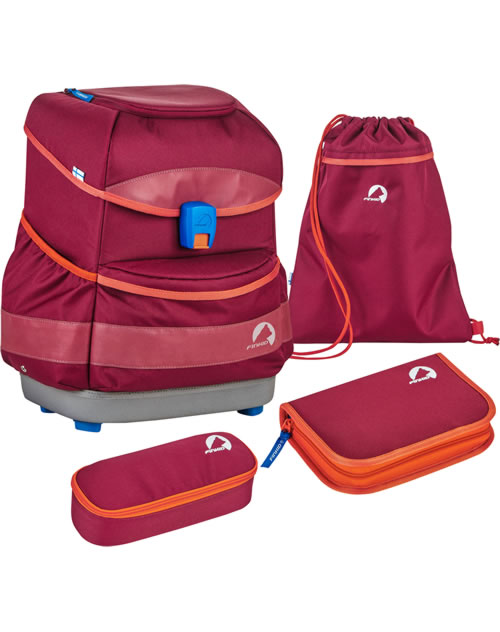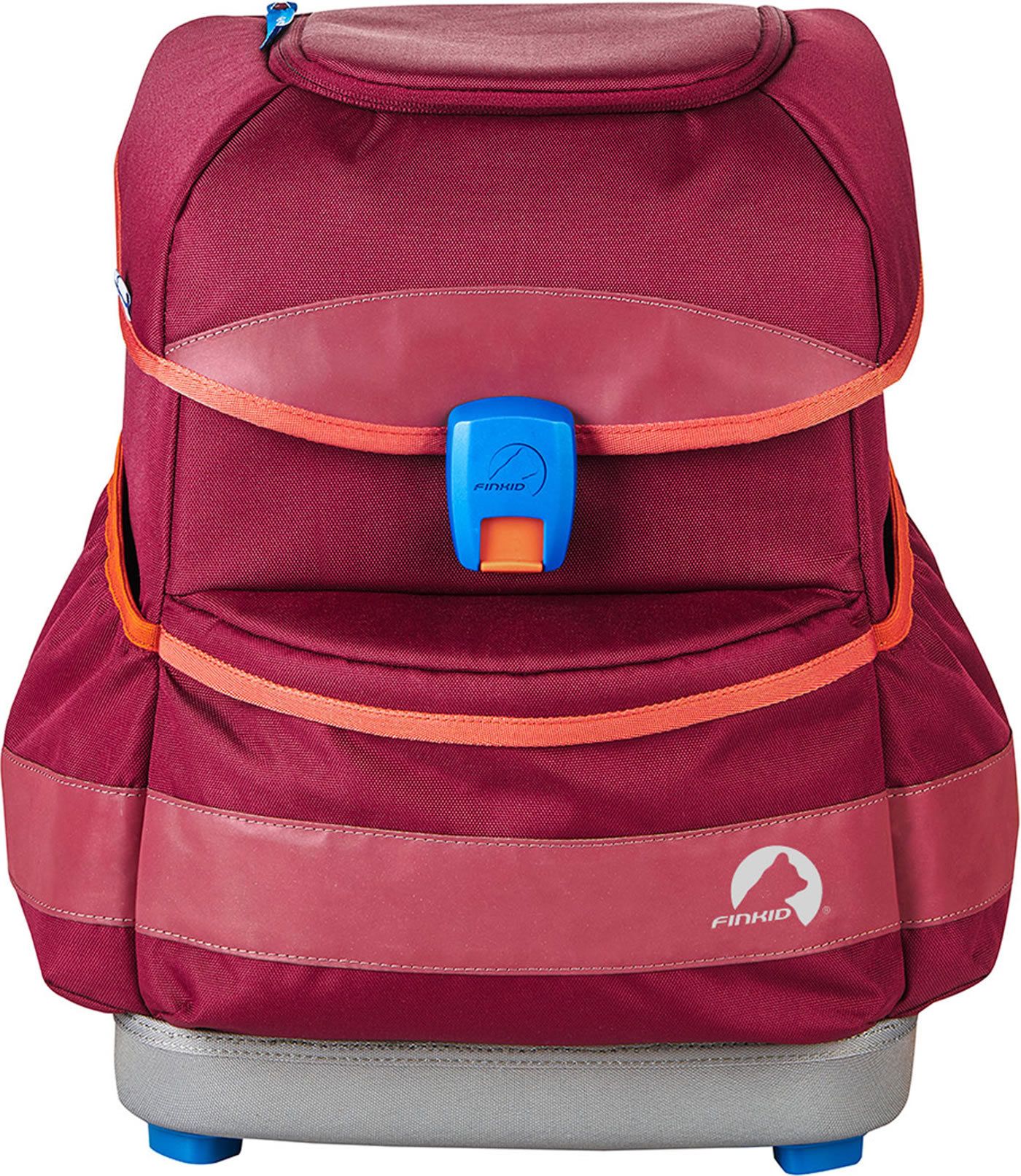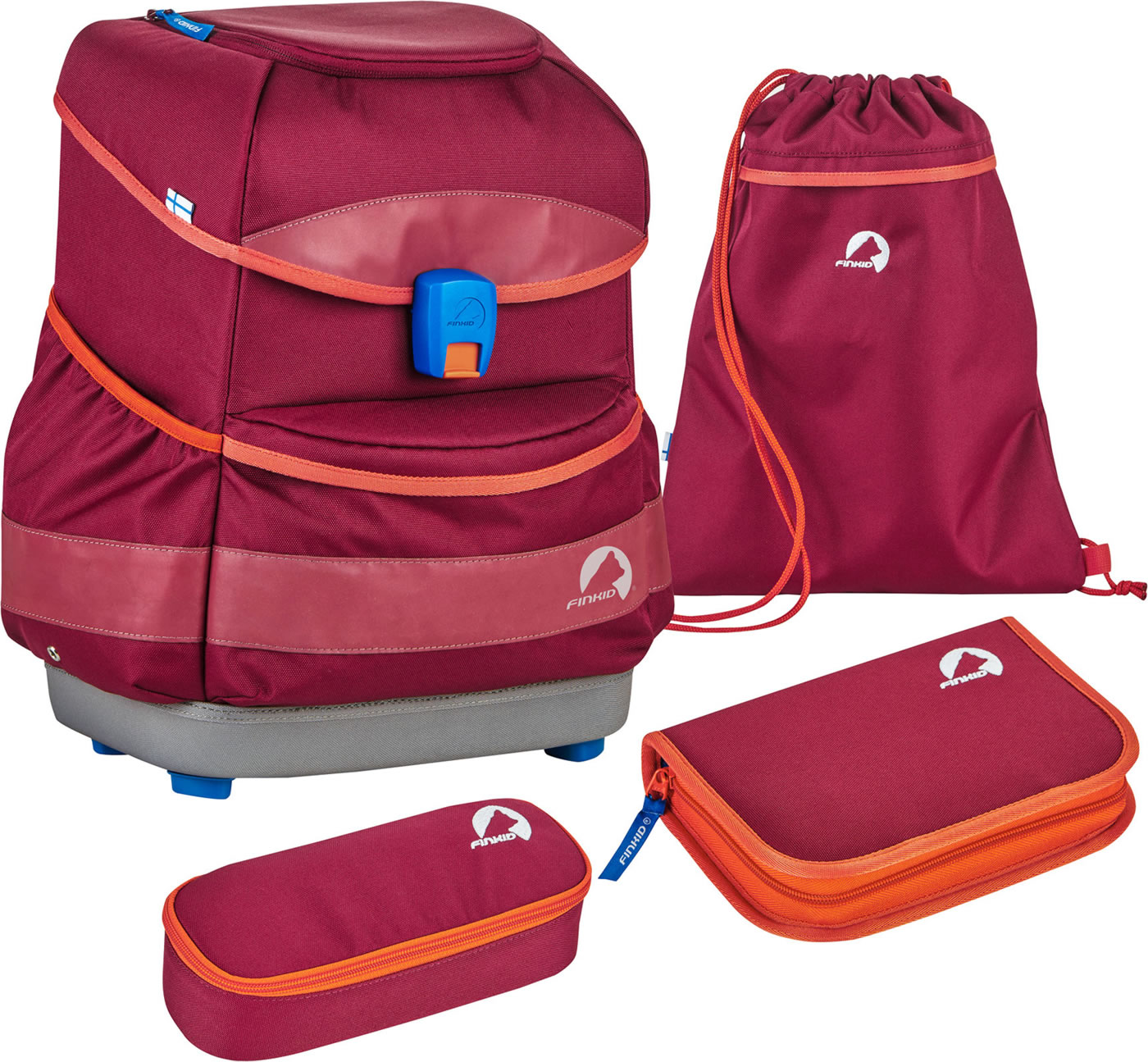 Stabiler Schulrucksack BUDDY von FINKID mit Turnbeutel, Stiftemäppchen und gefüllter Federtasche. Der Ranzen ist ideal für den Schulanfang und dank des Mitwachs-Tragesystems auch darüber hinaus. Der Rücken und die Träger mit Brust- und Hüftgurt sind gepolstert und erleichtern das Tragen. Der Hartschalenboden macht den Ranzen sehr robust und vier Füße sorgen für einen guten Stand.