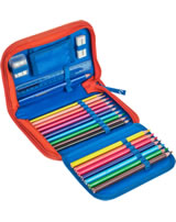Das passenden Zubehör besteht aus Turnbeutel, Stiftemäppchen und befüllter Federtasche mit Buntstiften, Bleistift, Anspitzer, Radierer, Portemonnaie und Lineal.