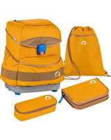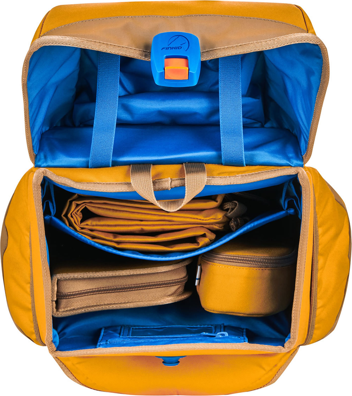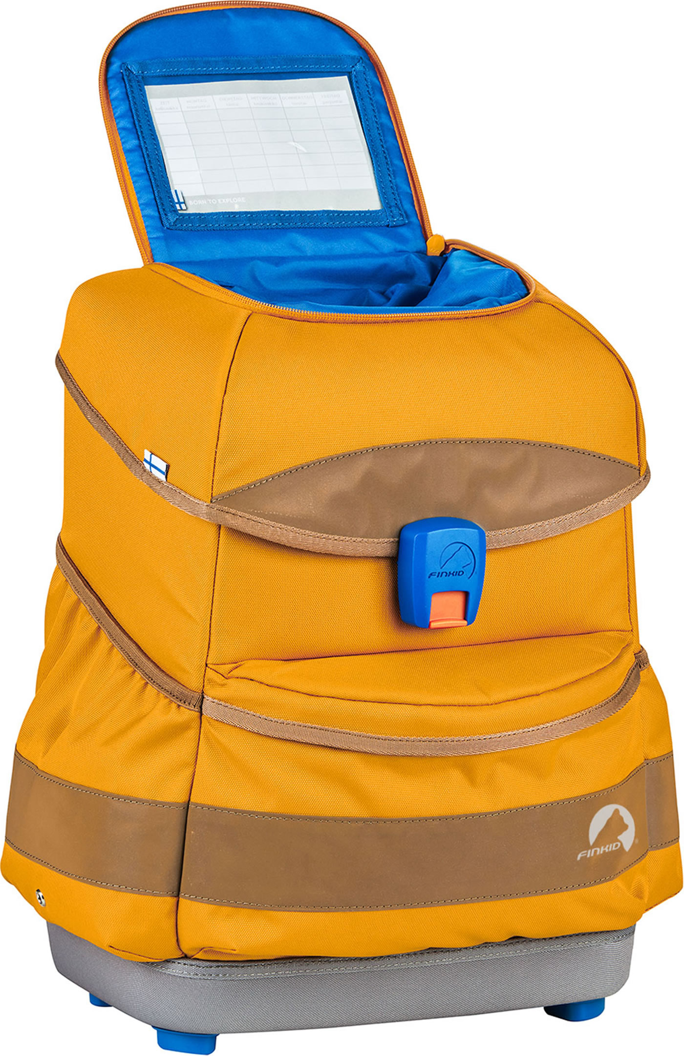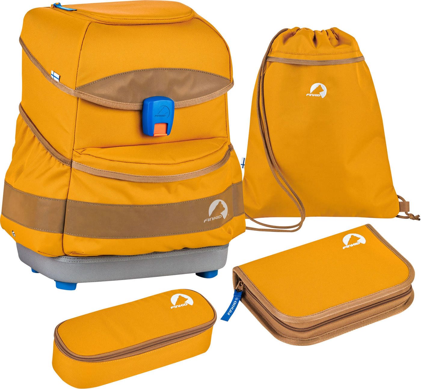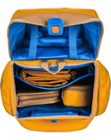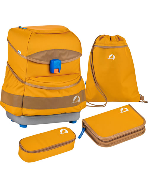 Stabiler Schulrucksack BUDDY von FINKID mit Turnbeutel, Stiftemäppchen und gefüllter Federtasche. Der Ranzen ist ideal für den Schulanfang und dank des Mitwachs-Tragesystems auch darüber hinaus. Der Rücken und die Träger mit Brust- und Hüftgurt sind gepolstert und erleichtern das Tragen. Der Hartschalenboden macht den Ranzen sehr robust und vier Füße sorgen für einen guten Stand.