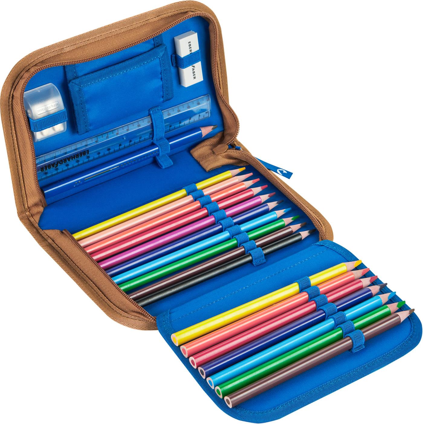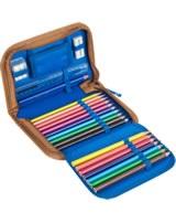 Das passenden Zubehör besteht aus Turnbeutel, Stiftemäppchen und befüllter Federtasche mit Buntstiften, Bleistift, Anspitzer, Radierer, Portemonnaie und Lineal.