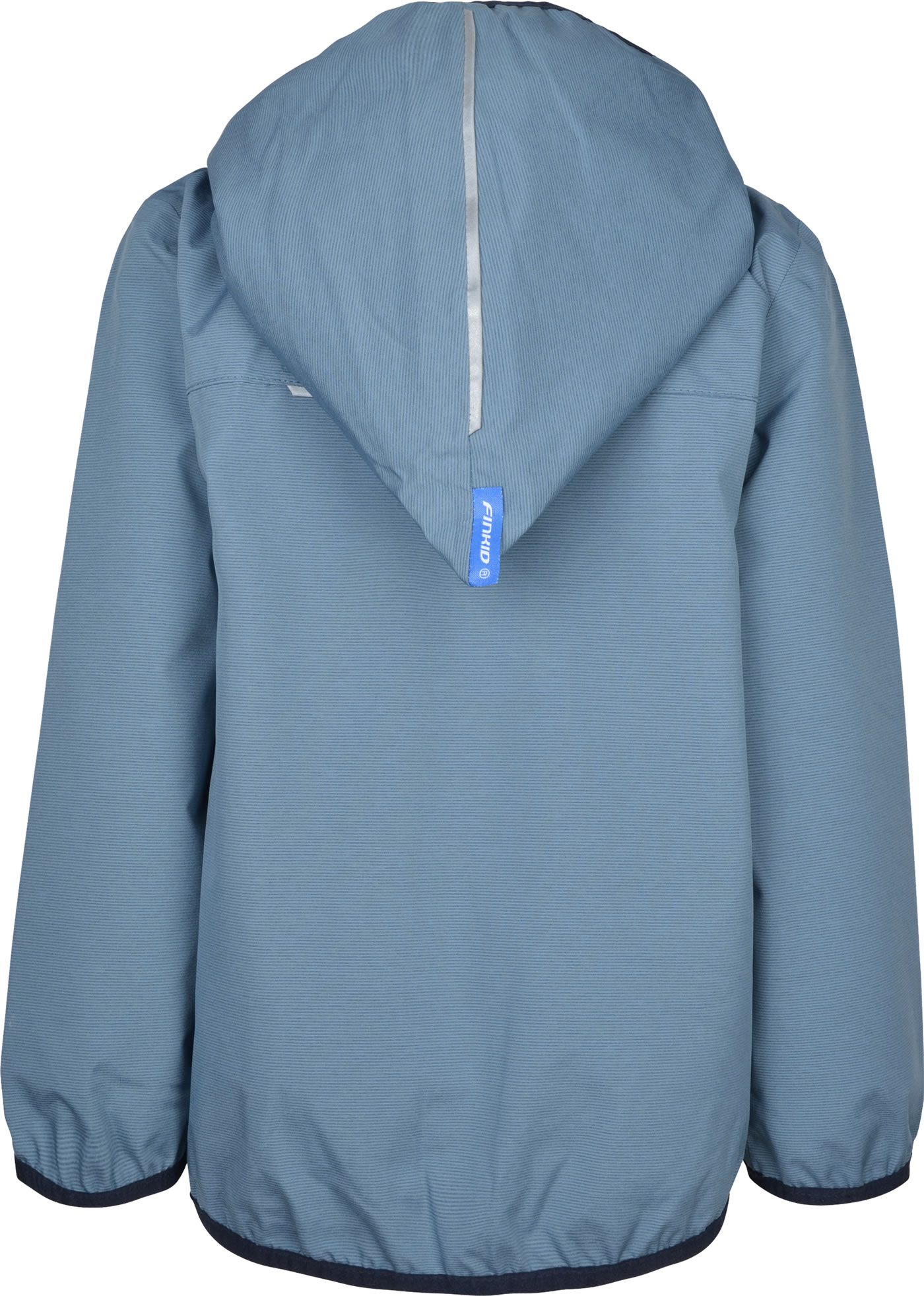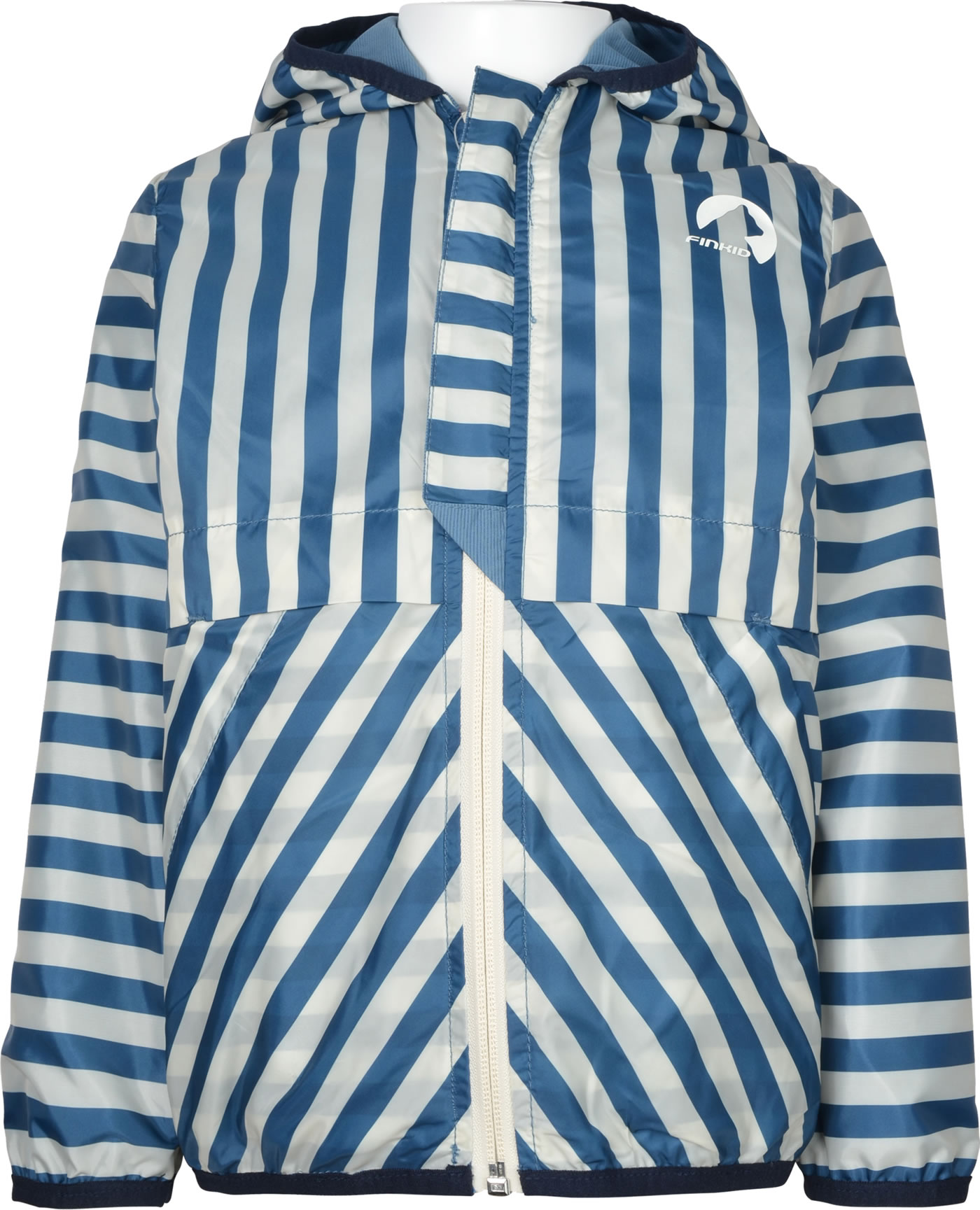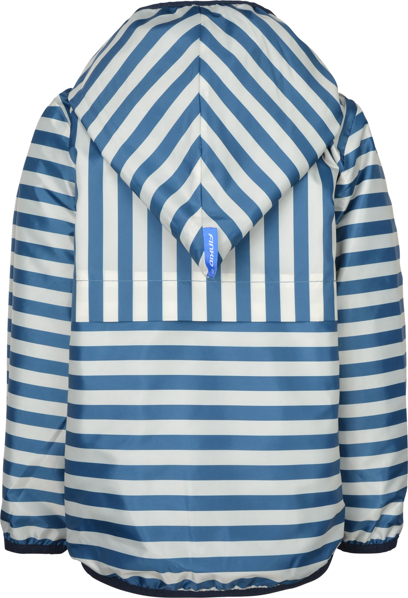 Bei jedem Wetter gut ausgerüstet mit der Regenjacke VALAS von FINKID. Die Jacke läßt sich je nach Wetterlage mit der wasserfesten unifarbenen Seite nach außen tragen oder bei Sonnenschein mit der gestreiften Seite nach außen. Große Taschen auf der Vorderseite bieten viel Platz für die wichtigsten Dinge. Reflektierende Elemante sorgen für eine bessere Sichtbarkeit im Dunkeln. Für einen guten Sitz sorgen die Bündchen an Saum, Armen und an der Kapuze.