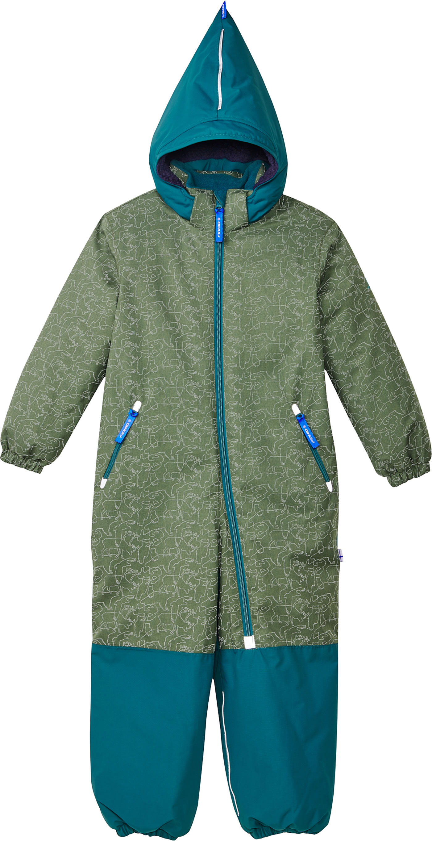 Der winterfeste Overall TURVA ICE von FINKID ist robust und durch die Wattierung kuschelig warm. Die atmungsaktive BIONIC-FINISH ECO-Imprägnierung ist fluorfrei und macht sie wasser- und schmutzabweisend. In der abnehmbaren Kapuze befindet sich weiches Teddy-Plüsch. Fleece-Futter am Kragen und am oberen Rücken sorgt für zusätzliche Wärme. Alle Nähte sind versiegelt. Elastische Fußschlaufen verhindern Hochrutschen der Beinabschlüsse. Der reflektierende Animal-Print auf dem Material und Reflexionsstreifen sorgen für eine bessere Sichtbarkeit im Dunkeln.