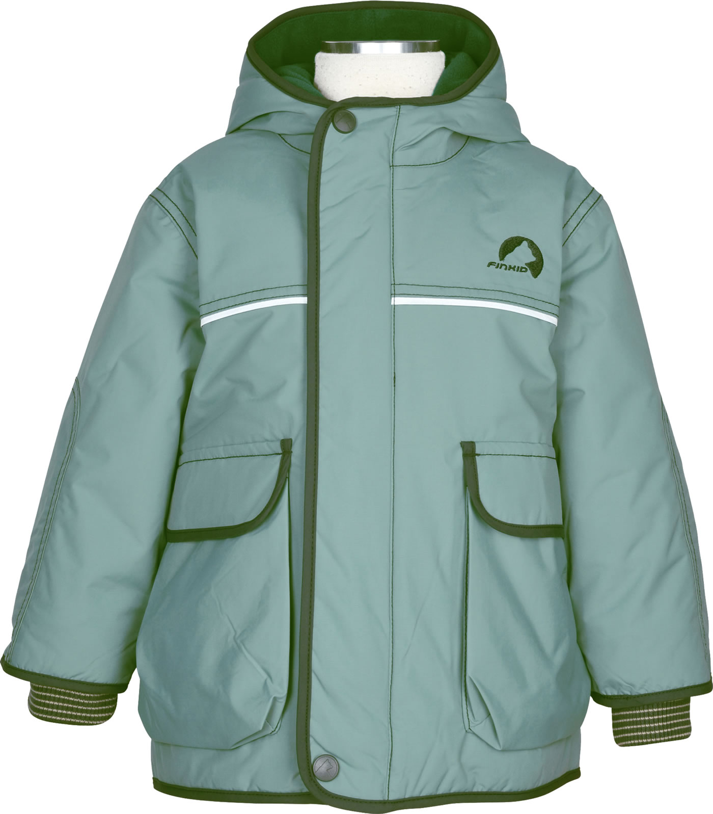 Warmer Winter-Parka TALVI EKO mit Fleece-Futter und fester Kapuze von FINKID. Die atmungsaktive und wasserfeste Jacke ist robust. Zwei aufgesetzte Taschen mit Klettverschluss auf der Vorderseite. Der Reißverschluss ist mit einer zusätzlichen Lage gegen Wind geschützt, so kann keine Kälte eindringen. Innen mit Schneefang. Alle Nähte sind versiegelt. Vorn und hinten befinden sich reflektierende Elemente. Die Jacke ist zu einem großen Teil aus recycelten Materialien.