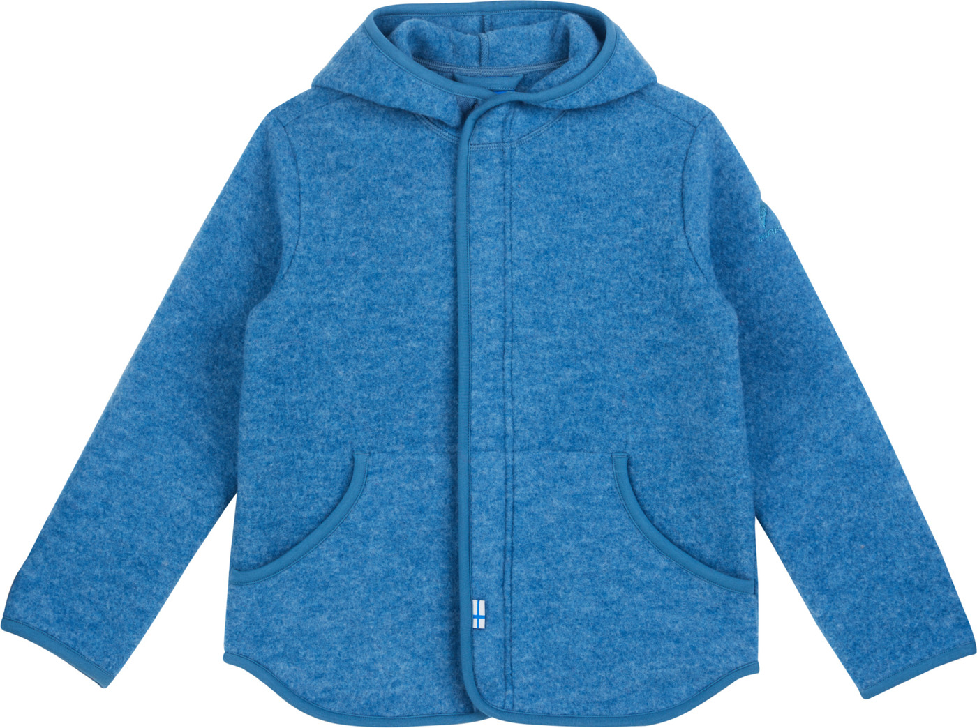 Die Fleecejacke hat die für Finkid typische Zipfelkapuze. Ab Größe 120/130 ist die Kapuze abgerundet.