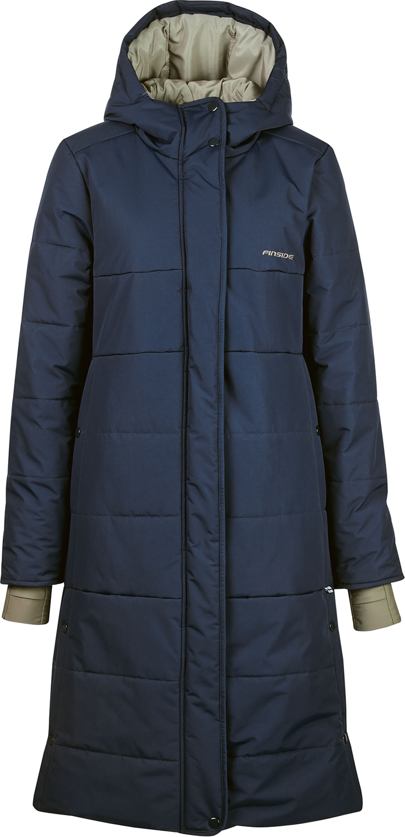 Wasserfester und winddichter Damen-Wintermantel MOJOVA mit tailliertem Schnitt von FINSIDE. Große Taschen mit Druckknöpfen bieten viel Platz. Der Reißverschluss wird durch eine Druckknopfleiste verdeckt. Praktisch ist die große Kapuze mit Tunnelzug: sie lässt sich dank Druckknöpfen in der Höhe verstellen, um den Kopf optimal angepasst warm und trocken zu halten. In einer abgestimmten Farbe ist das Futter der wärmeisolierenden und atmungsaktiven Winterjacke gearbeitet. Die langen und weichen Ärmelbündchen sorgen für hohen Tragekomfort. Die Druckknöpfe am unteren Ende des Mantels können geöffnet werden und bieten dadurch mehr Beinfreiheit.