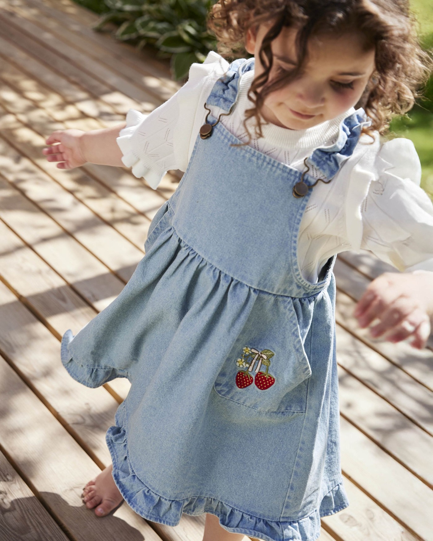 Durch die mit Rüschen verzierten Latzträger lässt es sich kinderleicht an- und ausziehen. 🙂