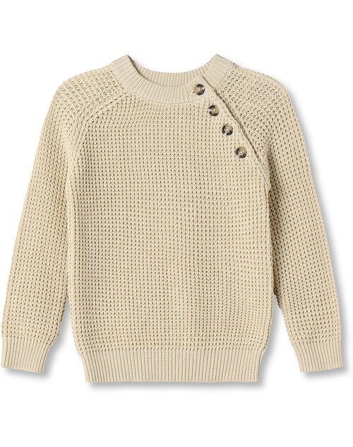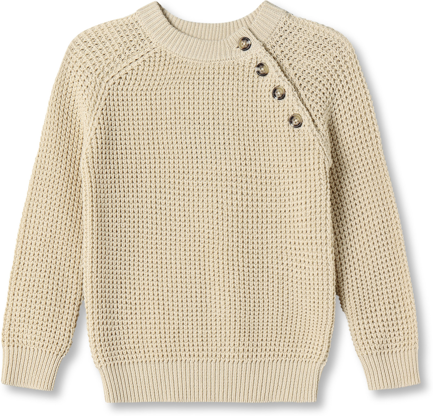 Der Pullover hat einen Rundhalsausschnitt und hübsche, praktische Knöpfe an der Schulter, die An- und Ausziehen erleichtern 🥰