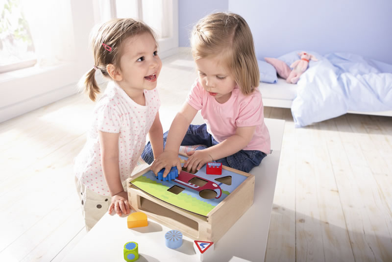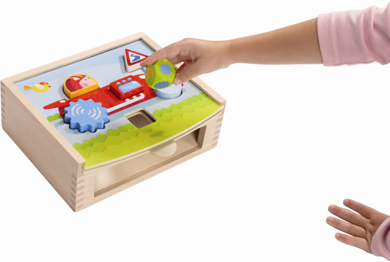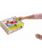 Contenu : boîte à formes avec deux couvercles, 5 pièces en bois, 1 dé, 1 règle dujeu