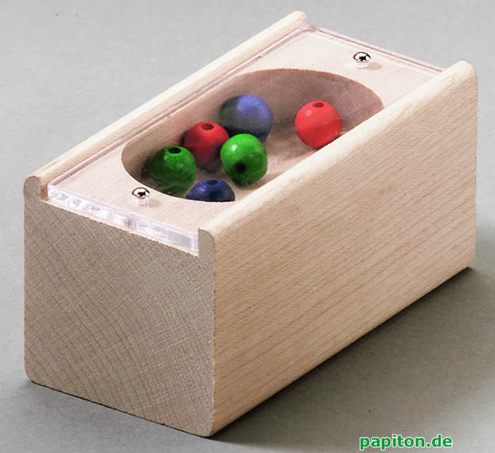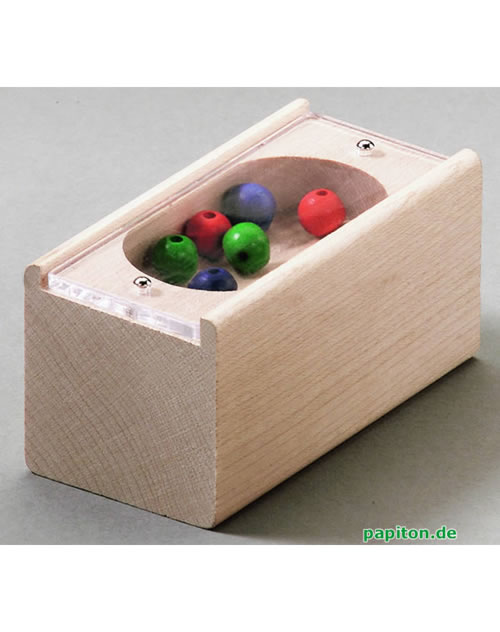 7 pièces en bois de couleurs et de surfaces différentes, pour déve-lopper la préhension et le toucher, une crécelle, un bouton couineur, un miroir et un hochet.e