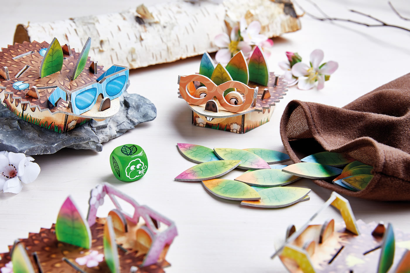 4 hérissons (en 3 parties + 1 paire de lunettes), 30 feuilles, 1 dé, 1 sac de feuilles, 1 règle du jeu