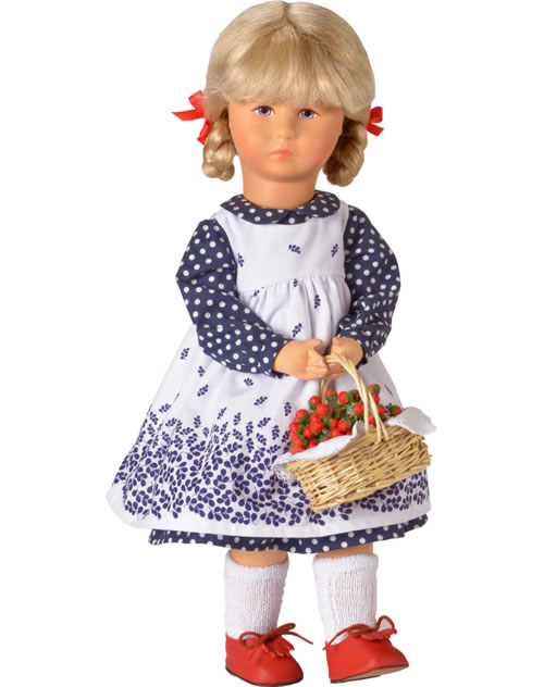 Mimerle is the Käthe Kruse classic. Her blond hair, is styled, as always, into two loops and tied together with red ribbons. Over her blue dress, with small white polka dots she wears an apron with a border of many leaves. The white socks with cable pattern and the red leather shoes are matching her clothing. Her handmade basket is covered with a white cloth and filled with strawberries.