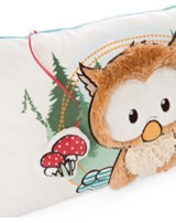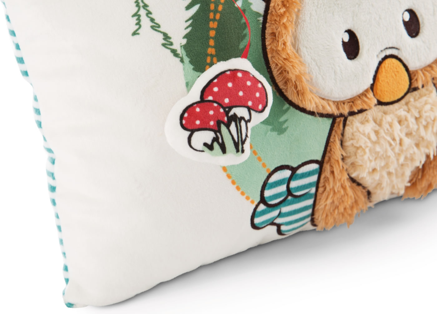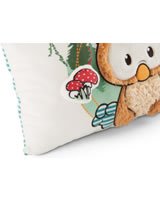 La scène de la forêt sur l'oreiller correspond au petit hibou Owlino. Sa fourrure douce se distingue comme une application et un petit pendentif champignon vénéneux est attaché comme un porte-bonheur. Le dos de l'oreiller est rayé vert dans une couleur assortie.