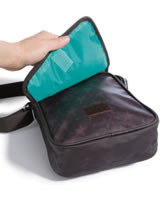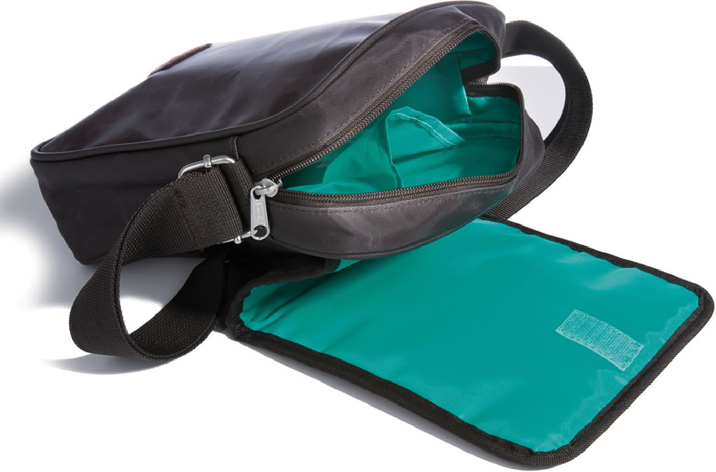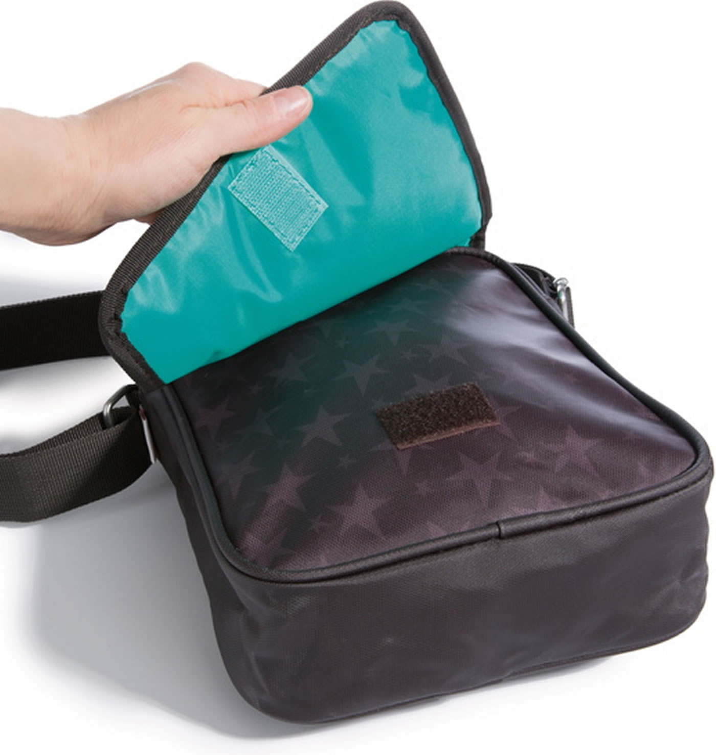 Le sac a un grand compartiment intérieur avec deux poches. La sangle est réglable. Sous le rabat se trouve la fermeture à glissière.