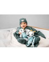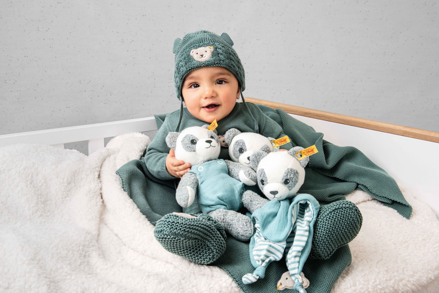 Paco le panda avec boîte à musique de Steiff est blanc et raffiné ou gris et ébourriffé. Respectueux de l'environnement, il est conçu en coton bio et rembourré de bouteilles PET recyclées. Sa peluche et la mousseline de colori pétrole sont certifiés 100% en coton bio (GOTS). Cette peluche musicale mesure 22 cm et la boite musicale est amovible.