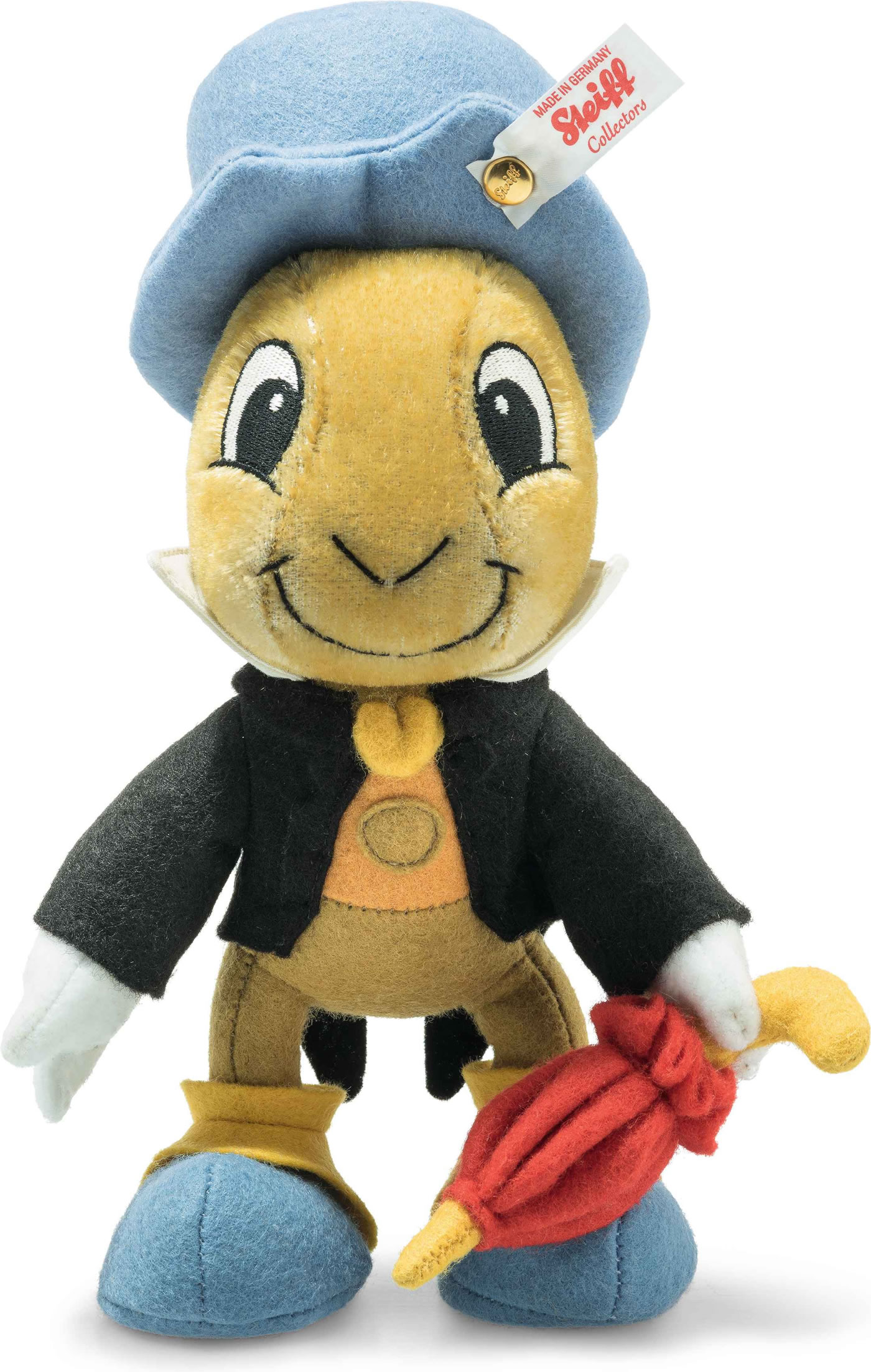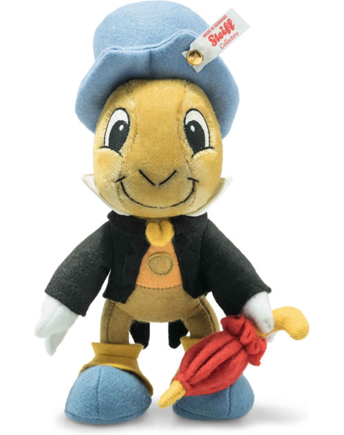 Pinocchio peut se fier à son meilleur ami Jiminy. Il se tient toujours à ses côtés, conseiller avisé et toujours confiant. Le grillon gentleman est présenté dans un mohair de qualité, vêtu d’une veste noire et d’un parapluie en feutre. Il porte des chaussures de couleur bleu et un chapeau cylindre bleu – peut-être en pensant à la féé bleue … « Avec sa permission, Jiminy le grillon ! »