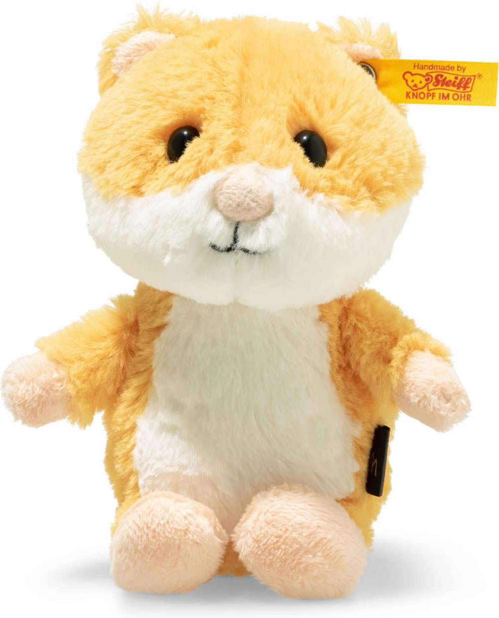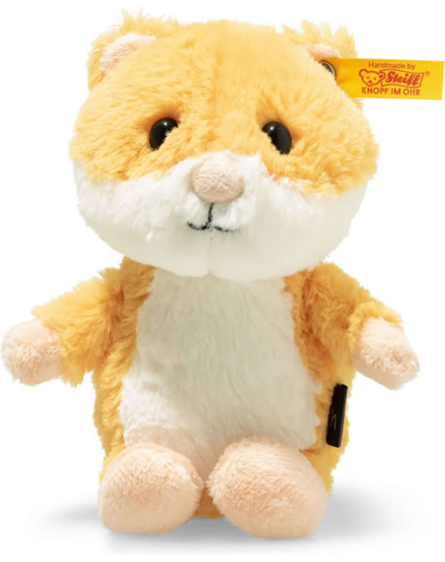 Happy hamster is a soft cuddly friend made of golden yellow plush fabric. Measuring 14 cm, it was designed by Andre Martin. The inside ears, nose and paws are skin-coloured. The tummy and face are white. A bean bag is sewn into the bottom to provide support. Use the "Steiff's Soft Cuddly Friends" sticker app to download stickers free of charge and send them by chat to friends and family. Available on Google Play (a brand of Google LLC) and from the App Store.