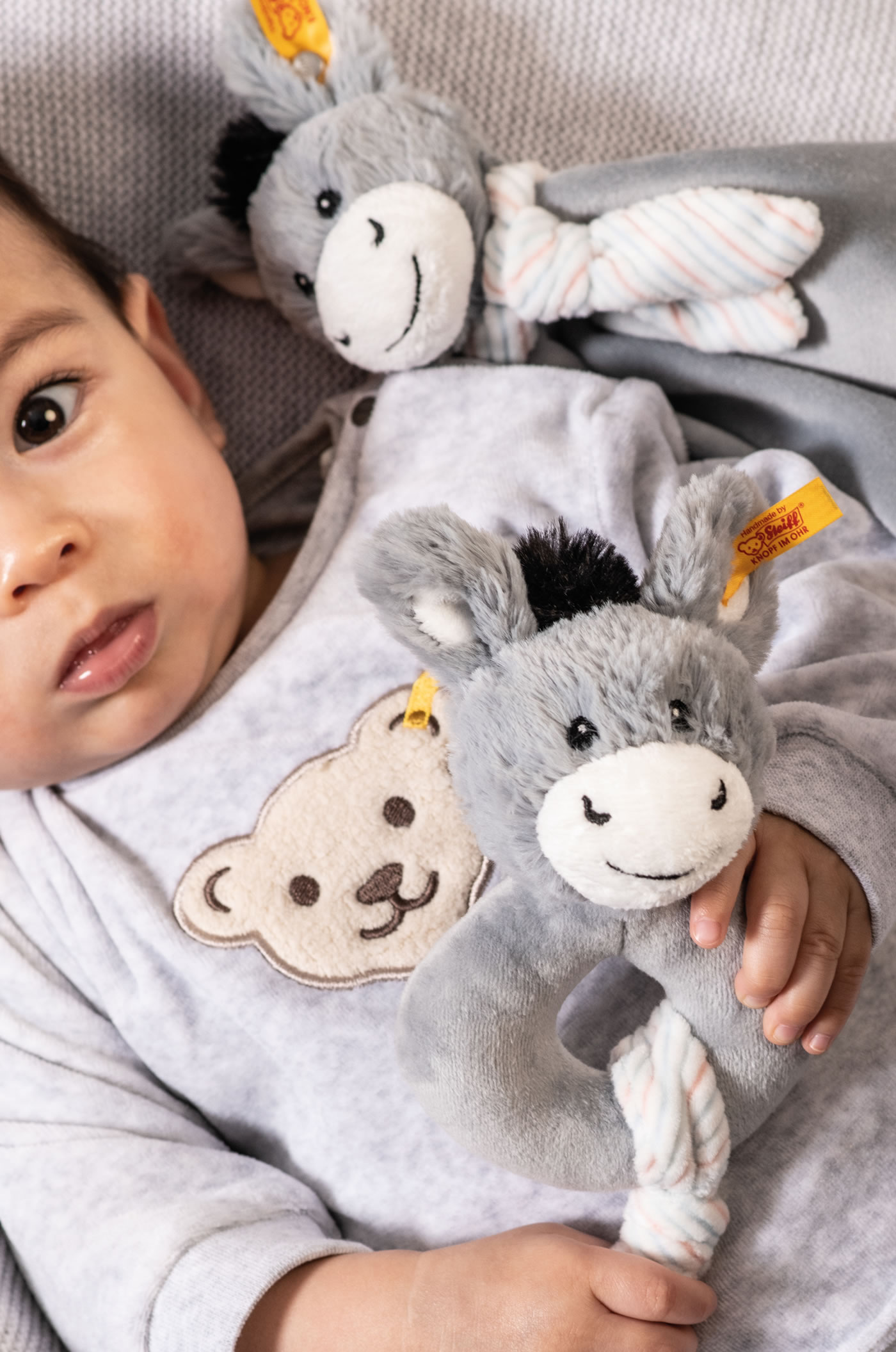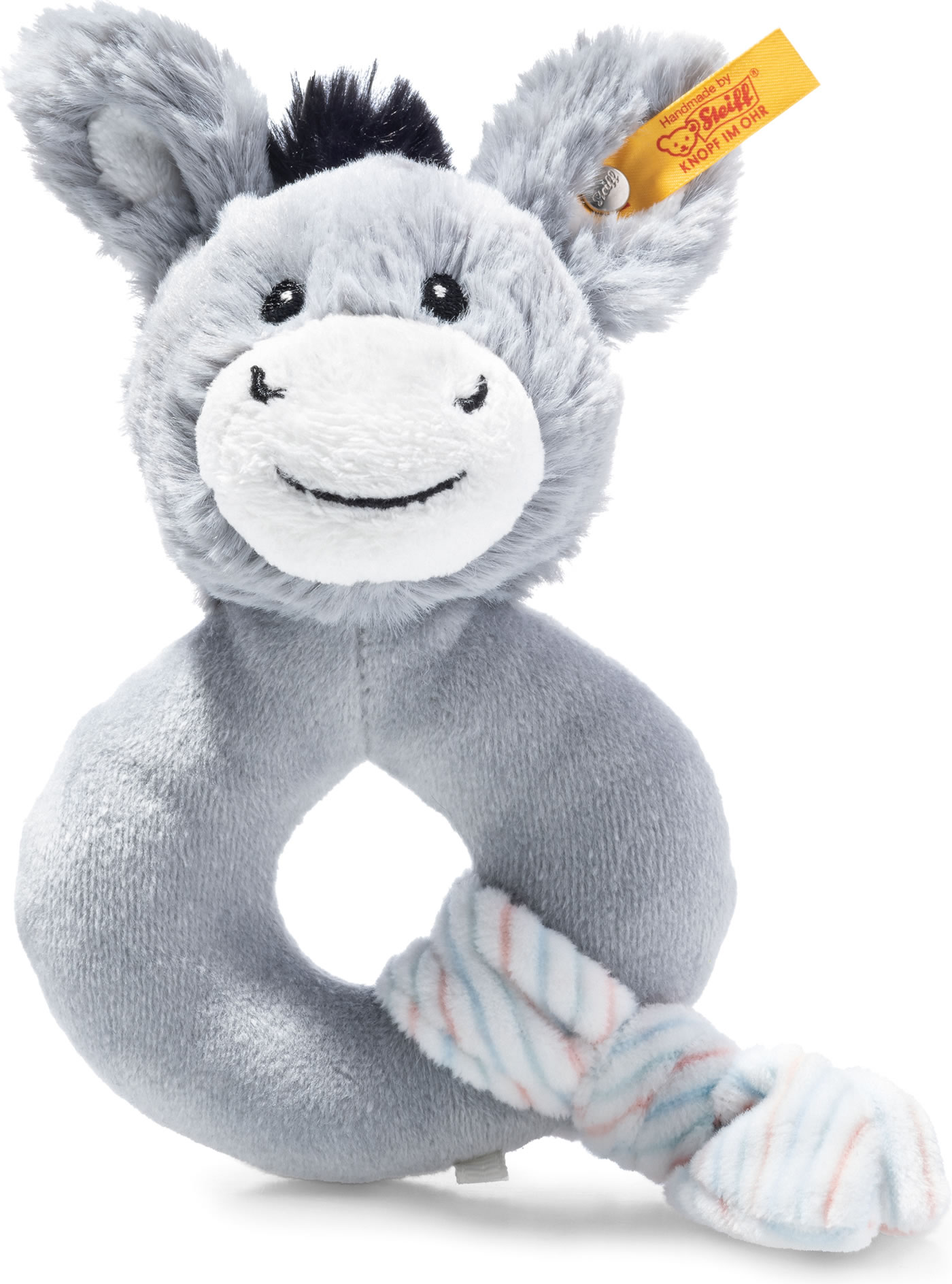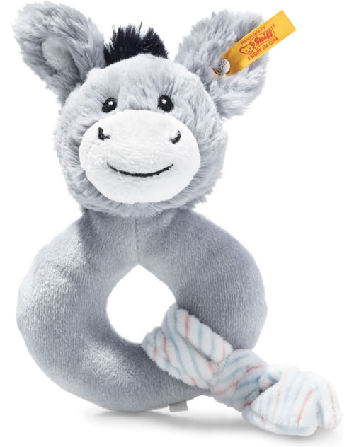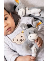L’anneau gris-bleu Soft Cuddly Friends Dinkie bourrique de 14 cm avec hochet en peluche pour la peau douce des bébés fait de l'apprentissage de la préhension une expérience. Le bébé joint les doigts, sent la bourrique et bouge la main... Et soudain, les deux se dirigent vers sa bouche ! La bourrique préhenseur avec hochet Dinkie offre un anneau solide, un tissu avec des nœuds et une tête de bourrique toute douce avec des yeux, un nez, une bouche, des oreilles et un hochet brodés - pour sentir, entendre, voir, saisir et bouger !