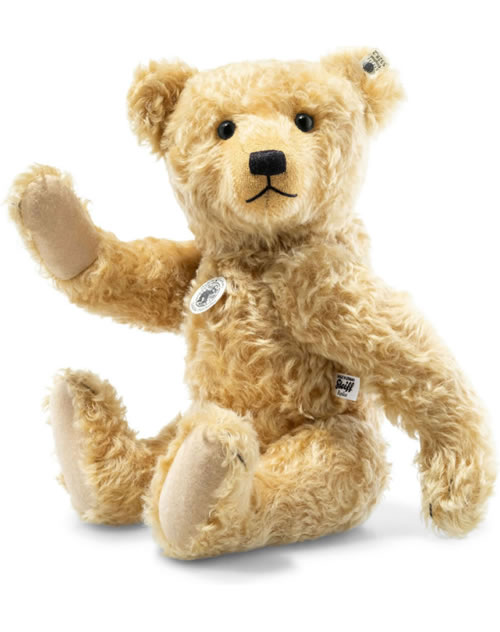 A veritable classic! Anyone who lays eyes on the blond Teddy bear replica 1910 cannot help but notice the influence of the original Steiff master craftsmen. With his clear gaze, confident demeanour, prominent bear hump and powerful paws, this friendly bear is impossible to resist. Stuffed with wood shavings and featuring glass eyes and a white tag, he combines all the insignia of classic-era Steiff bears...