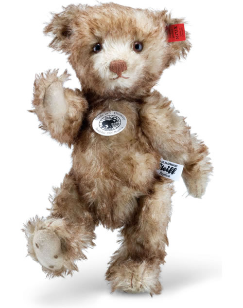 New or over ninety? You are not so sure when take your first glimpse of our Replica “Little Happy” Teddy bear from 1926. Because our Steiff designers have excelled in capturing every magical characteristic of the original. Even his stuffing is excelsior, like the original. His authentic look continues with his glass eyes and loosely jointed head. He even wears a period correct ear tag with "underscored button" made of patinated steel. But be assured “Little Happy” is new, despite the worn out pads and bald spots. Just take a look at the impeccable yarn of recently embroidered nose and the white Replica tag attached to his side. But we all grow old, and “Little Happy” will gladly grow old with you by your side.
