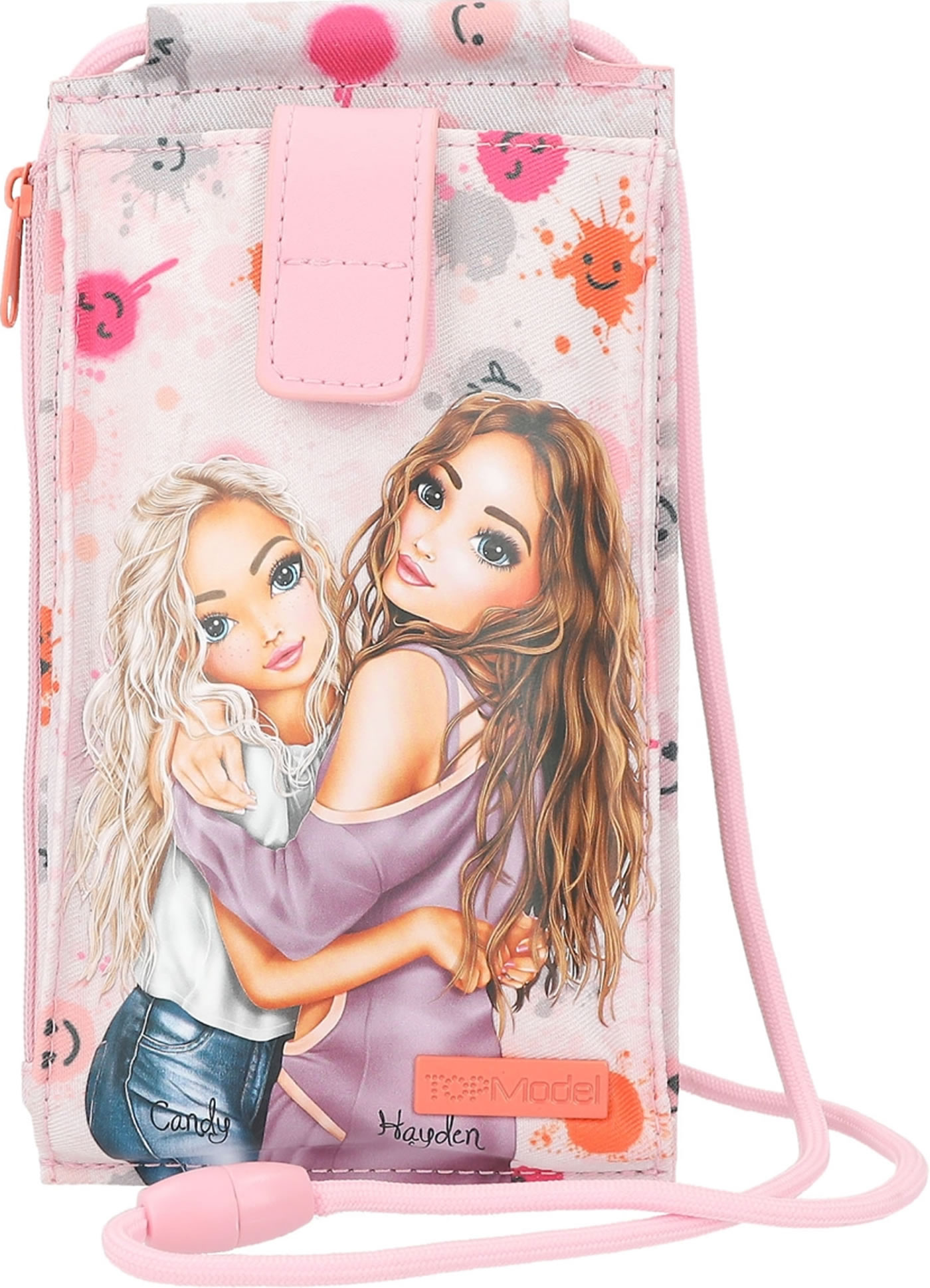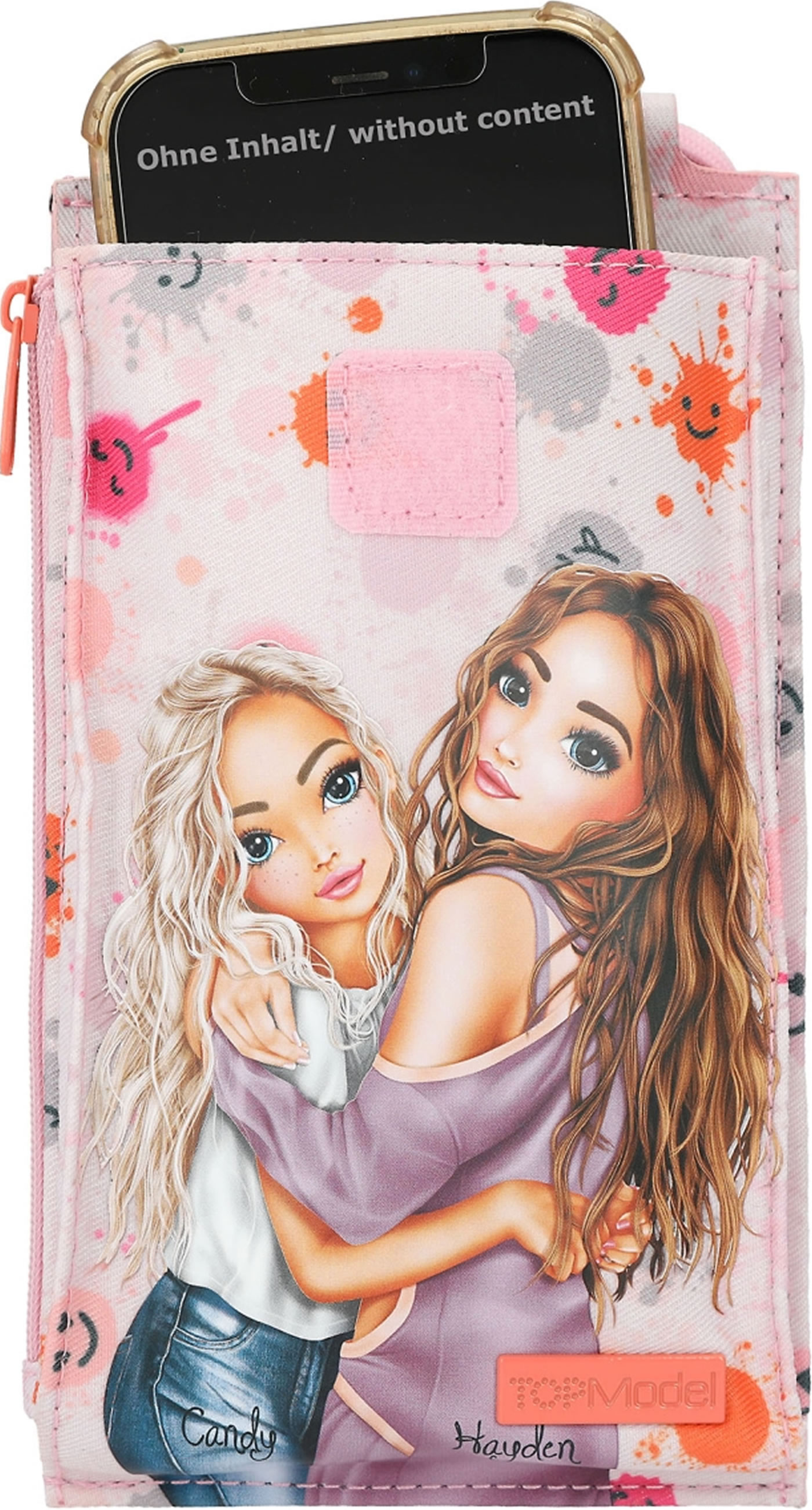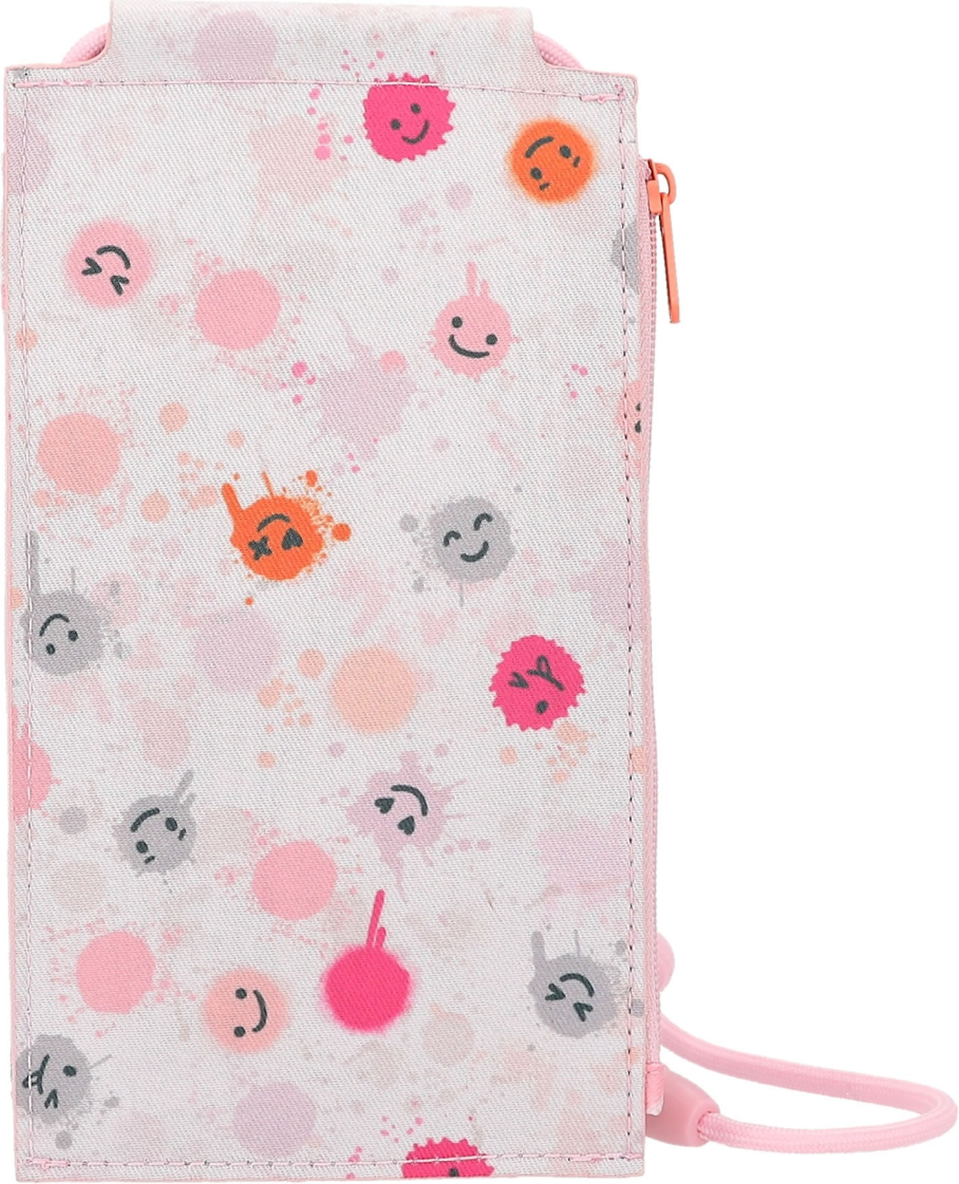 The smartphone case that puts you in a good mood: soft pink, brightly colored splashes of smileys and a cool TOPModel motif. With side zip and pocket with Velcro closure. The color-coordinated cord for hanging around the neck has a safety lock that opens with a sudden pull.