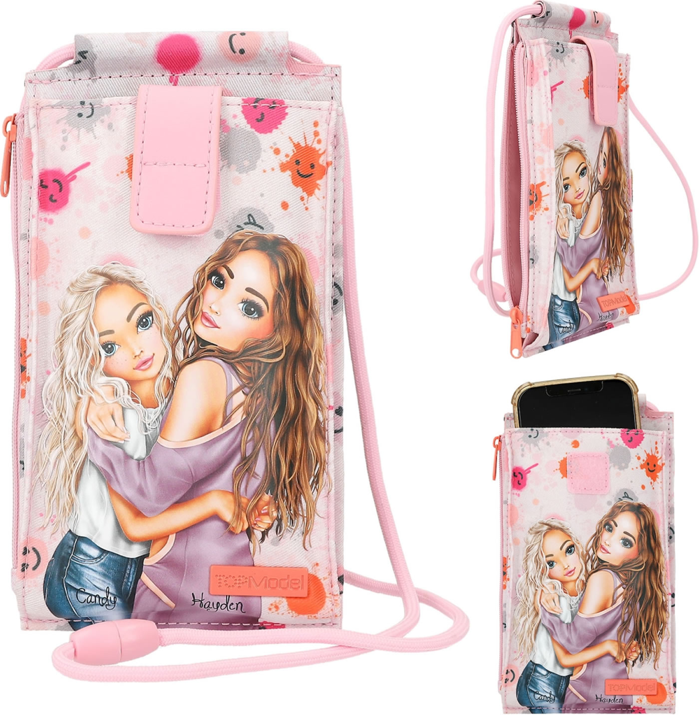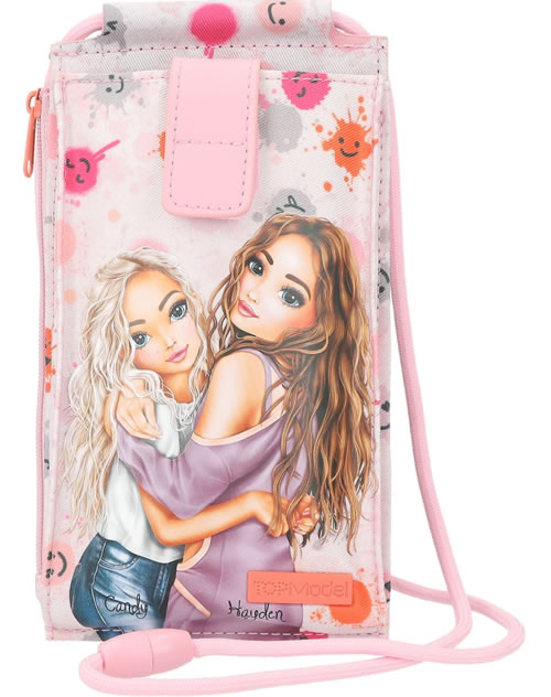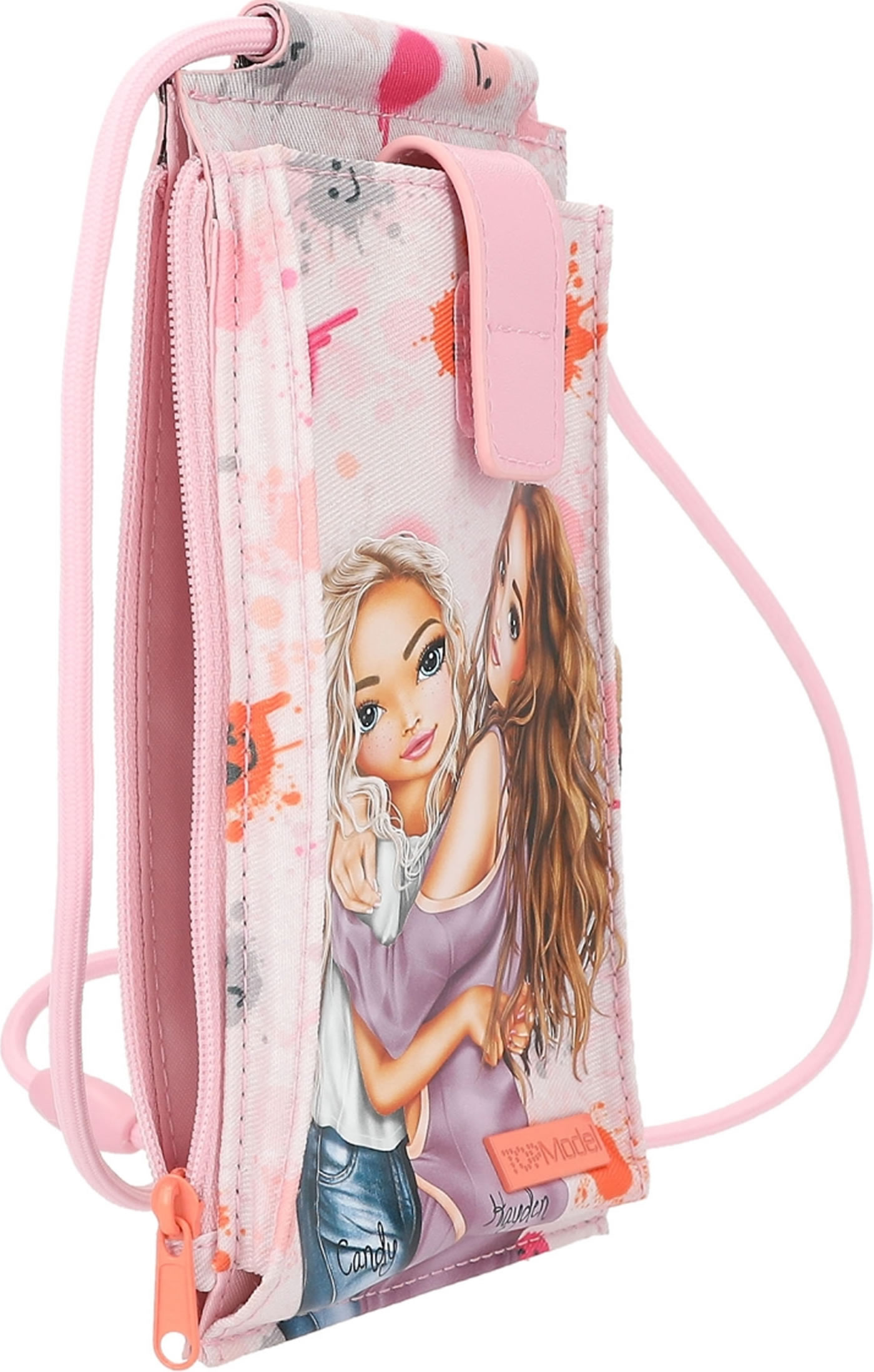 The smartphone case that puts you in a good mood: soft pink, brightly colored splashes of smileys and a cool TOPModel motif. With side zip and pocket with Velcro closure. The color-coordinated cord for hanging around the neck has a safety lock that opens with a sudden pull.