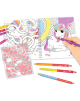40 pages de dessin et de jeu amusant sur le monde magique des licornes et des poneys magiques. Avec une jolie feuille d'autocollants et une superbe licorne à paillettes sur la couverture.