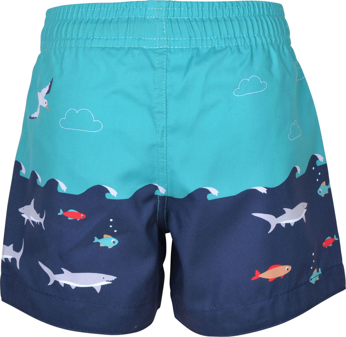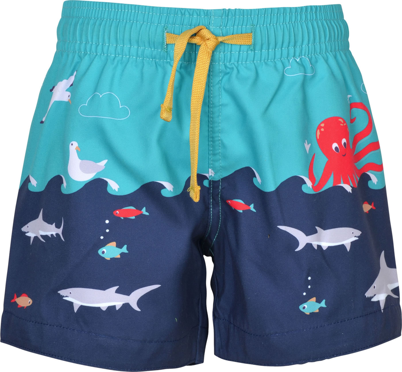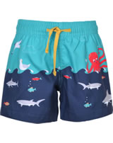 Schwimm-Shorts von FRUGI für Jungen. Das Muster mit den bunten Meeresbewohnern ist ein toller Blickfang. Innen ist die Badehose mit einem Einsatz aus Mesh-Gewebe versehen. Die Weite läßt sich mit einem Tunnelzug regulieren.