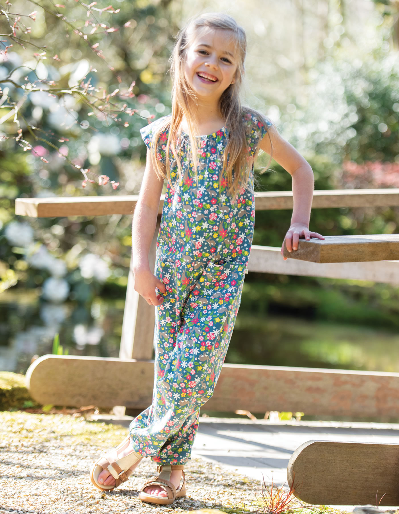 Toller Jumpsuit mit hübschem Hasen und Blumen-Muster sowie Schmetterlingsärmeln von FRUGI für Mädchen. Die bunten Farben und die kontrastfarbenen Motive machen dieses Kleidungsstück zu einem absoluten Blickfang. Zwei aufgesetzte Taschen auf der Vorderseite bieten Platz für Kleinigkeiten. Der Jumpsuit mit langem Bein lässt sich durch das weiche und luftige Material angenehm tragen - ideal für die warmen Tage im Jahr.