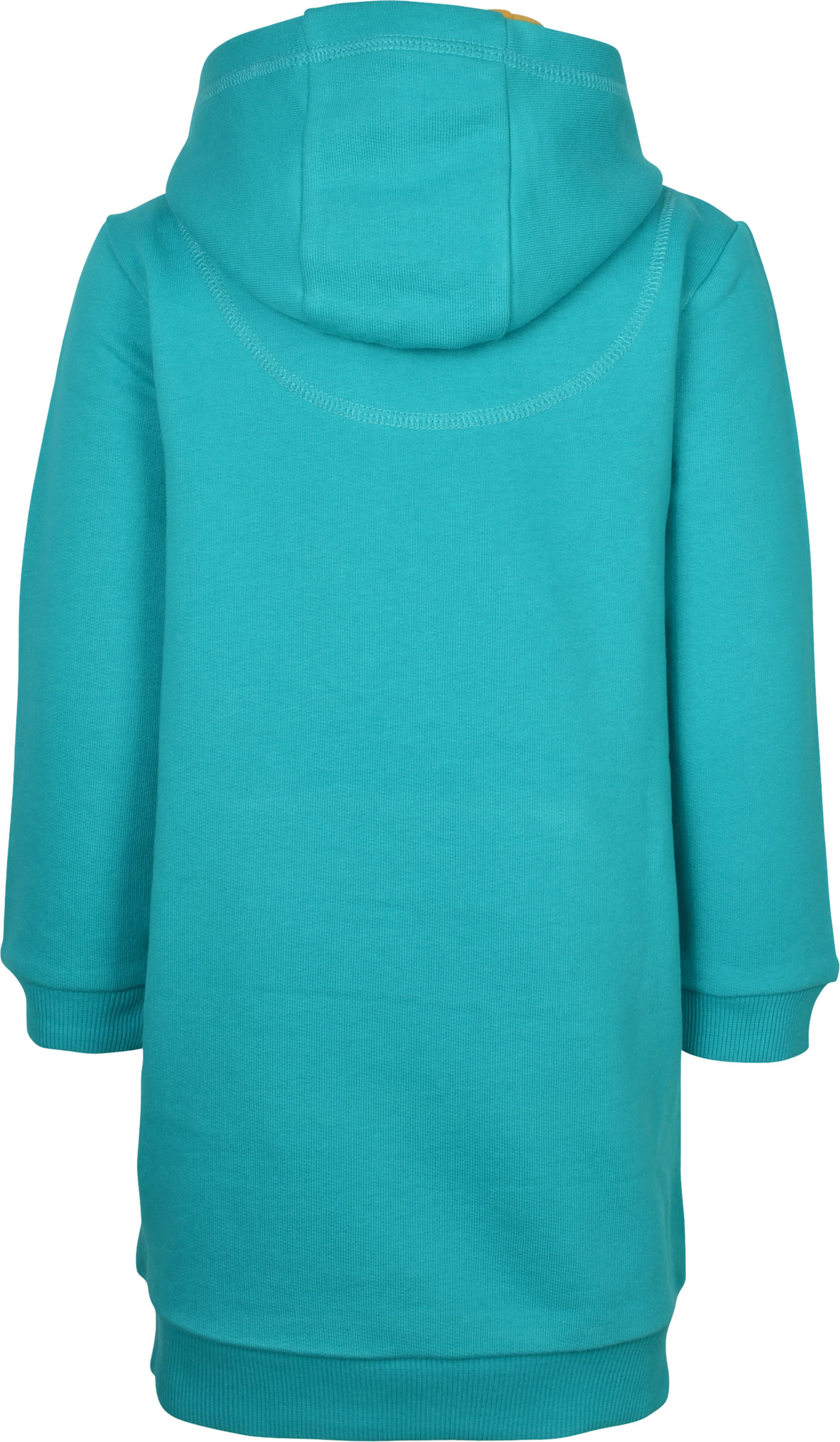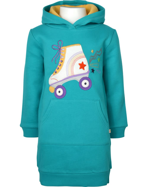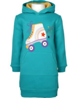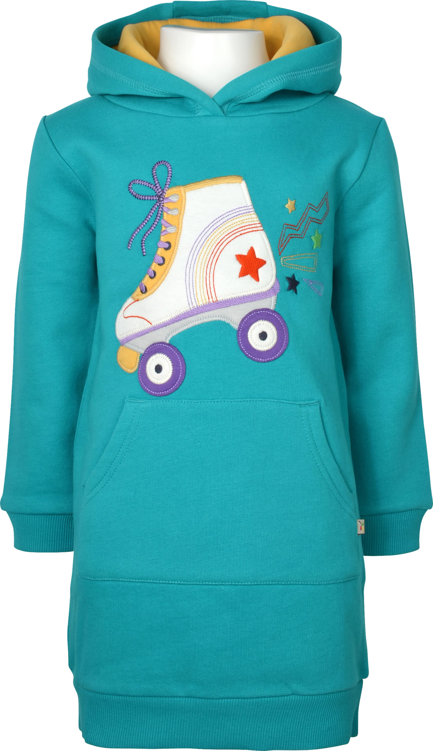 Langarm-Kleid aus weichem Sweatstoff von FRUGI. Innen ist das Kleid weich angeraut und damit ideal für kühlere Tage. Ein besonderer Hingucker ist der gestickte Rollschuh auf der Vorderseite. Schöne Details sind das farblich abgesetzte Kapuzenfutter und die kleine Bauchtasche.