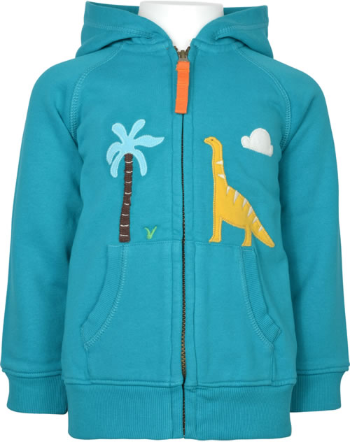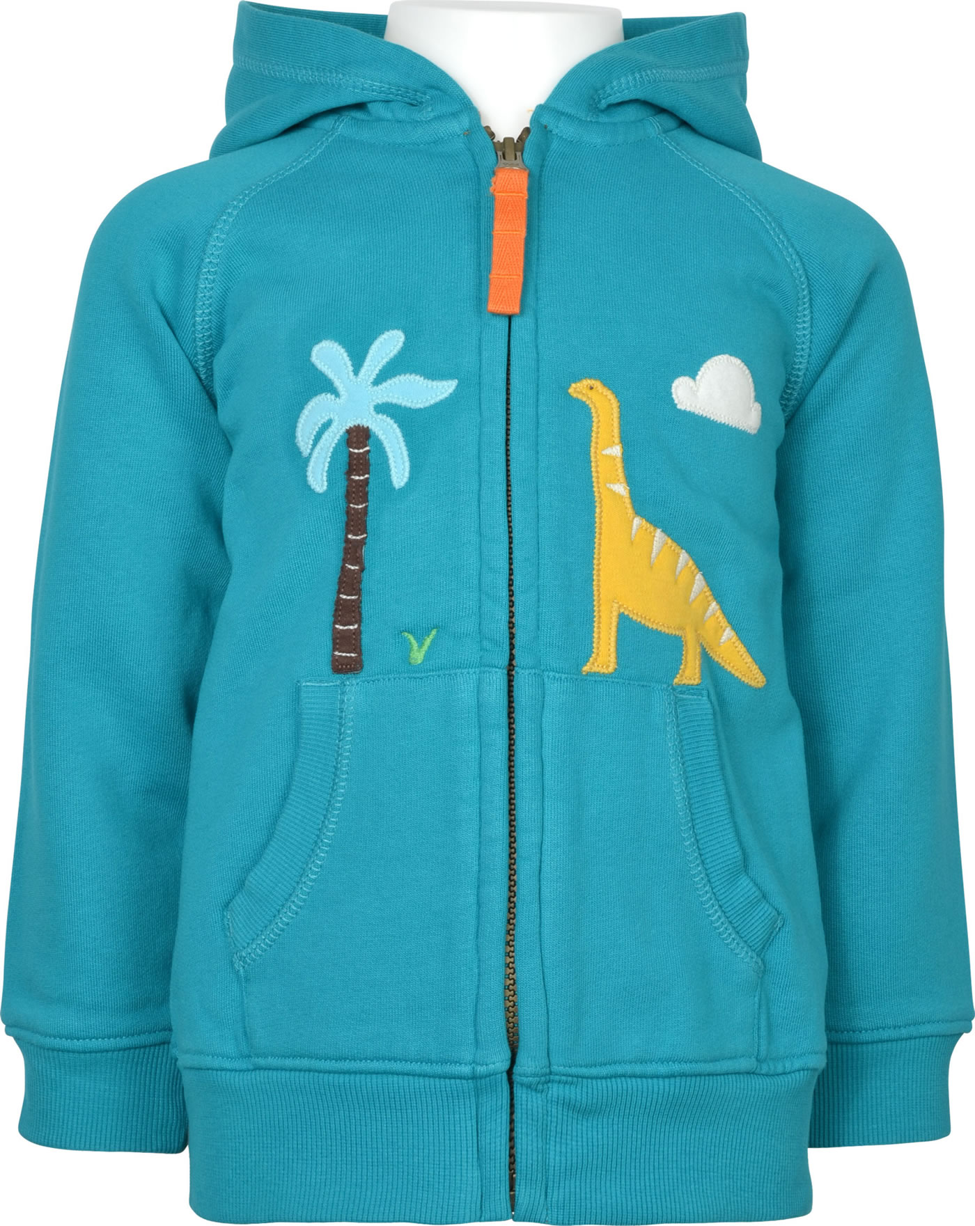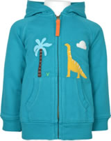 Sweatjacke aus organischer Baumwolle von FRUGI. Tolle Hingucker sind die Applikationen mit Palme und Dino. Schließen lässt sich die Jacke mit einen Reißverschluss und zwei Taschen bieten Platz für kleine Schätze. Die Kapuze ist farbig abgefüttert und bietet somit einen schönen Kontrast. Die Jacke ist weich angeraut und ideal für kühle Tage.