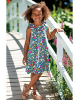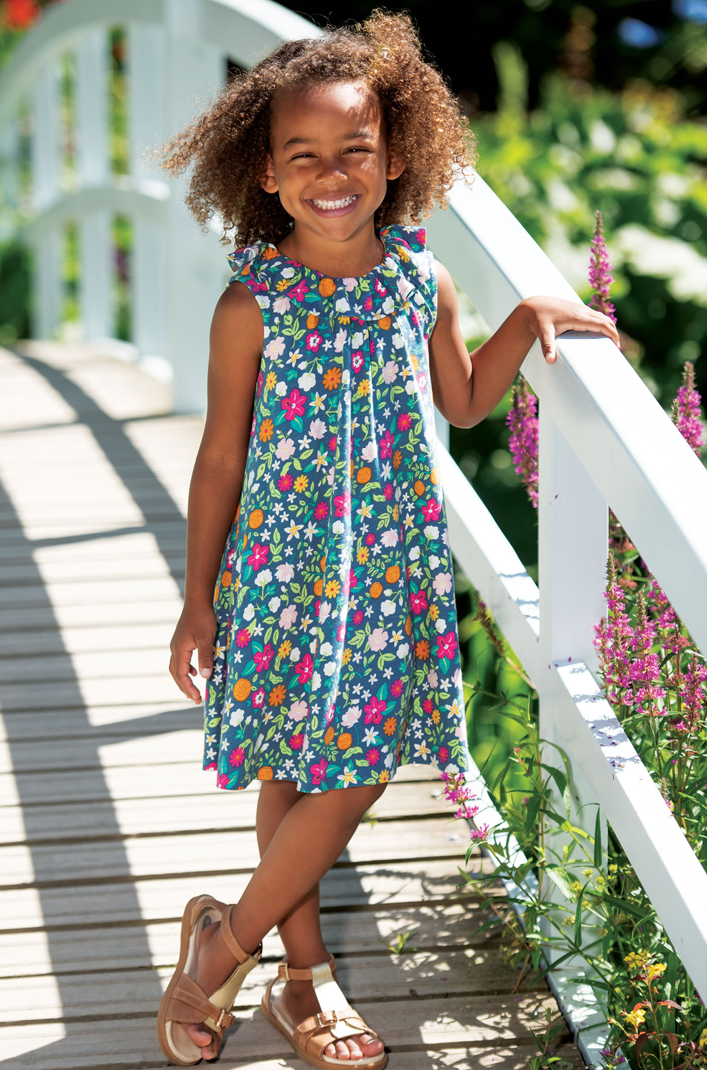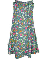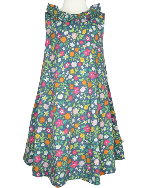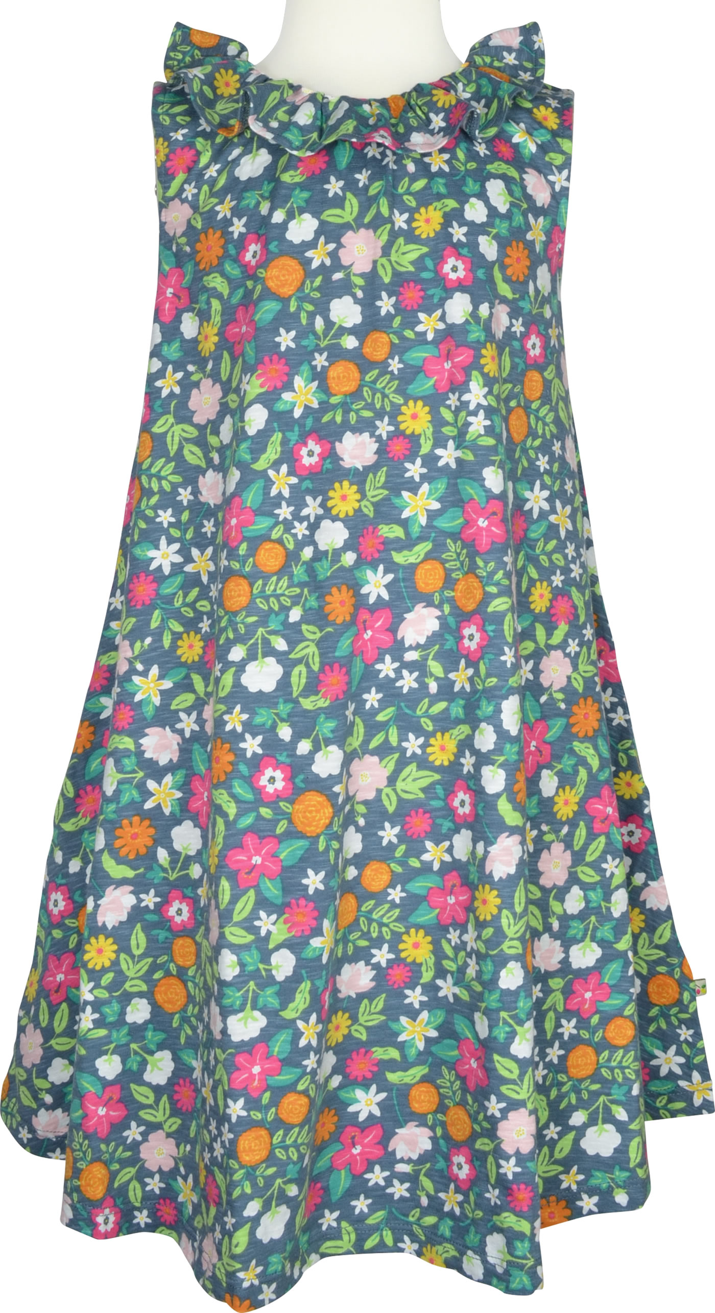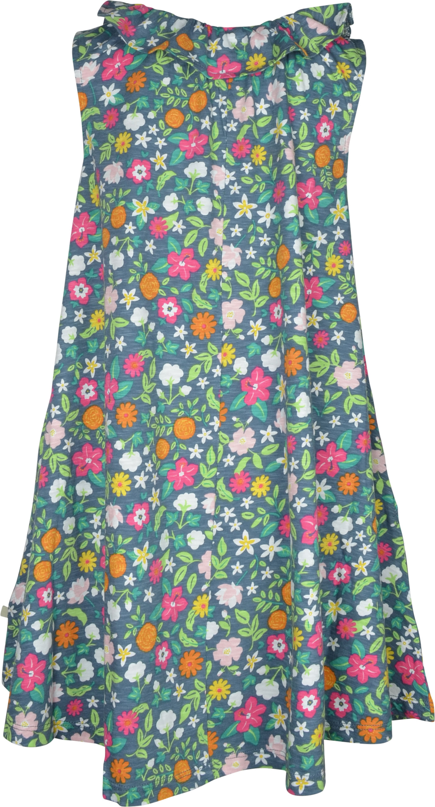 Ärmelloses Kleid von FRUGI. Das Kleid aus weichem Baumwoll-Jersey ist in A-Linie geschnitten. Für einen guten Sitz sorgt der Gummizug am Kragen. Das bunte Blumen-Muster und die Rüsche am Kragen machen das Kleid zu einem tollen Blickfang und in den beiden Taschen lassen sich kleine Schätze mitnehmen.
