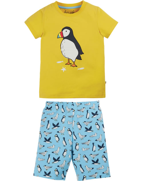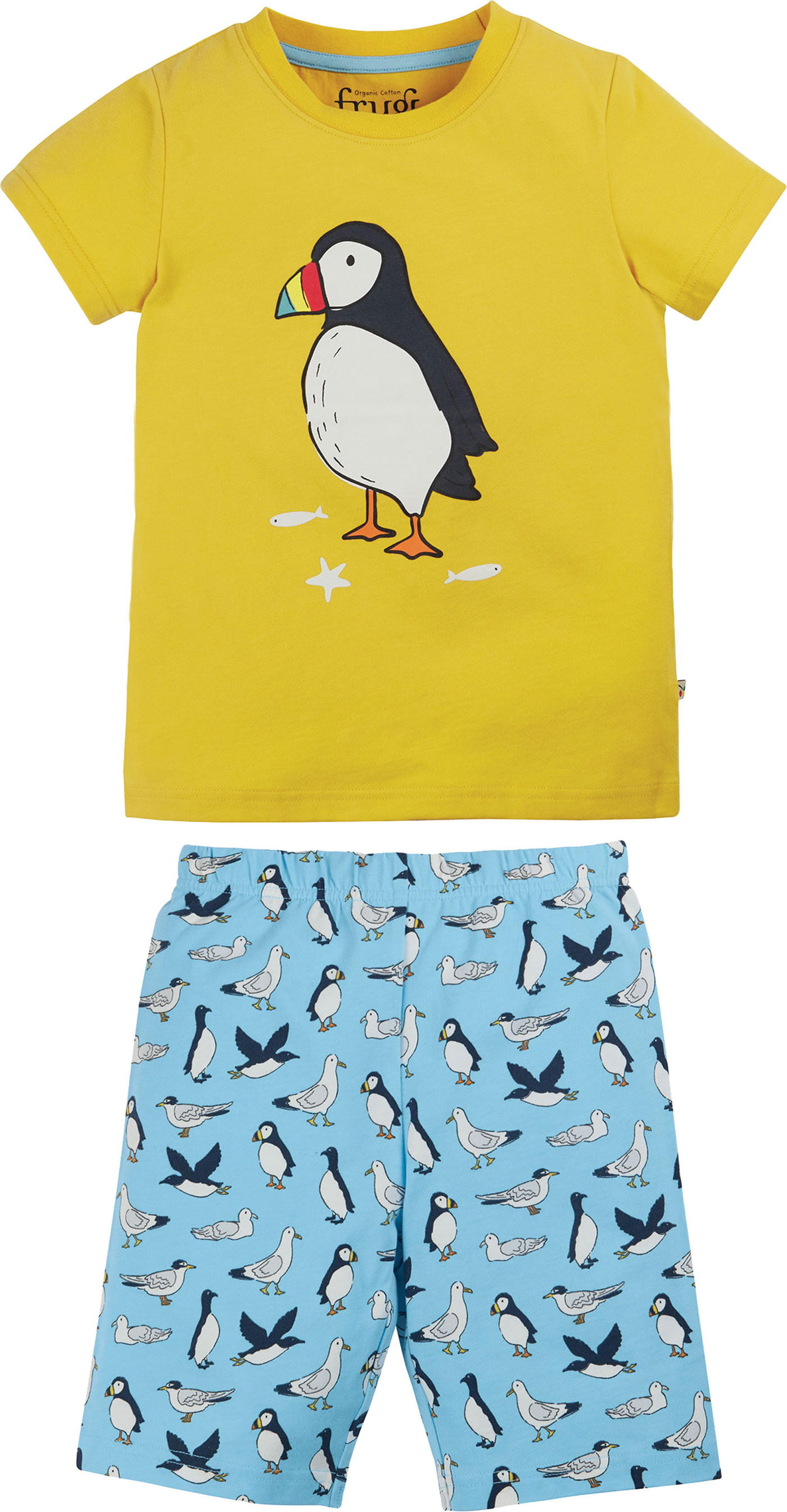 Gemütlicher Schlafanzug von FRUGI. Der Pyjama besteht aus einem Oberteil mit kurzen Ärmeln und einer Shorts. Eintoller Hingucker ist der Papageientaucher auf der Vorderseite. Passend dazu ist die Hose, auf der sich verschiedene Seevögel tummeln. Das weiche Material aus biologischer Baumwolle ist besonders anschmiegsam.