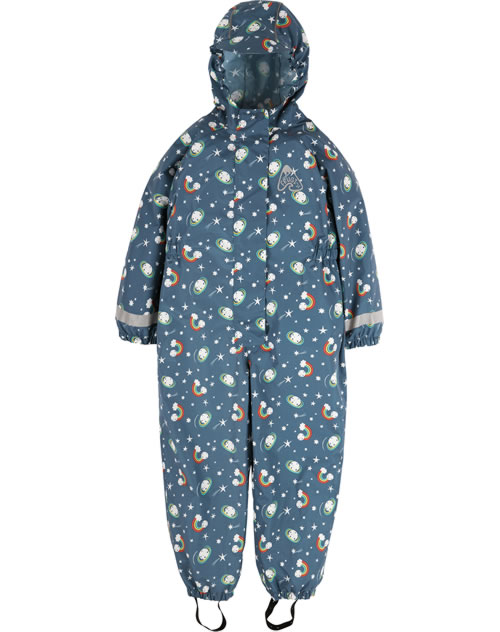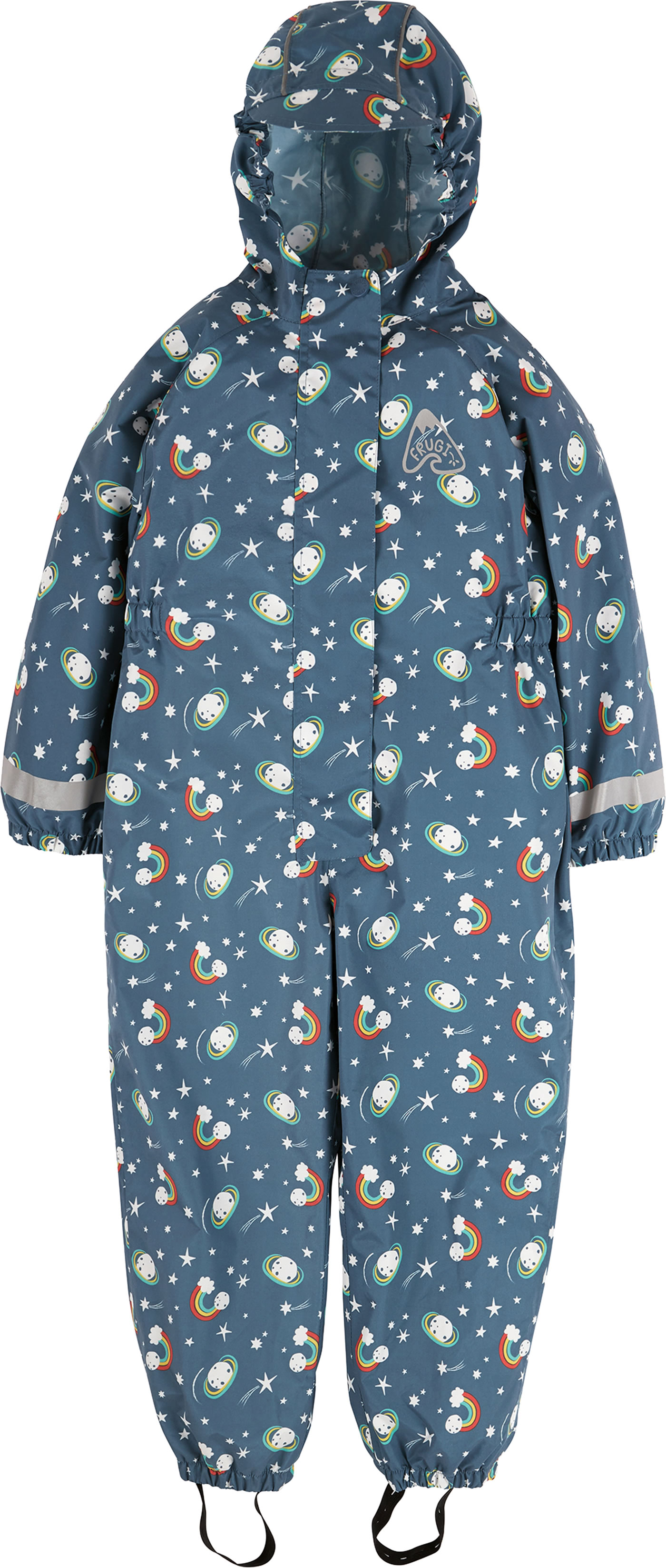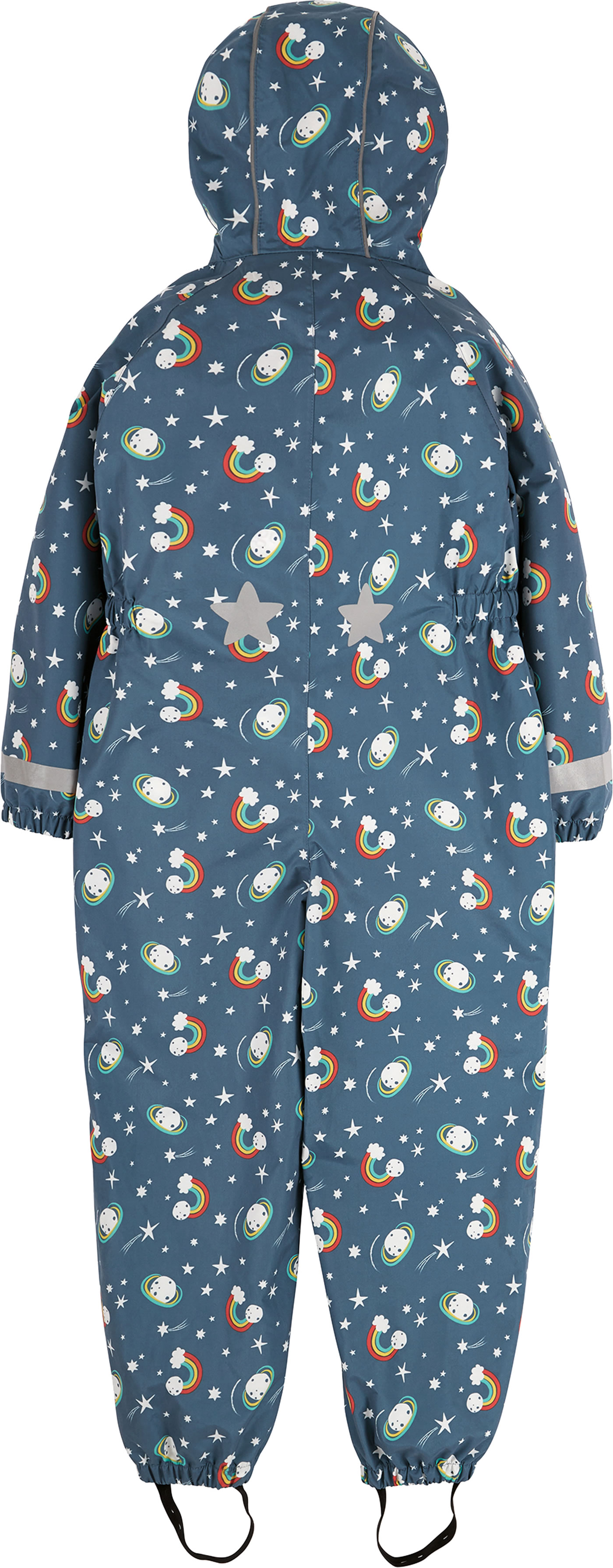 Overall aus 100 % recyceltem Polyester von FRUGI. Das Muster mit Sternen und Planeten macht diesen Overall zu einem echten Blickfang. Er ist fluorfrei hergestellt und ist wasser- und schmutzabweisend. Der Overall ist besonders leicht und das Material sorgt für einen hohen Tragekomfort. Ärmel, Kapuze und Beine sind mit Gummibündchen ausgestattet. Zusätzlich verhindern Fußstege ein Hochrutschen der Beine. Reflektierende Elemente sorgen für eine bessere Sichtbarkeit im Dunkeln.