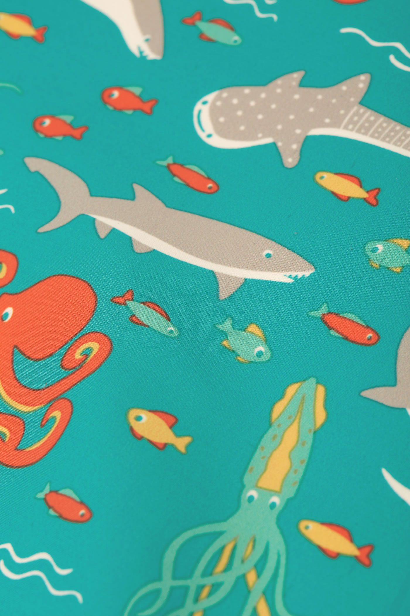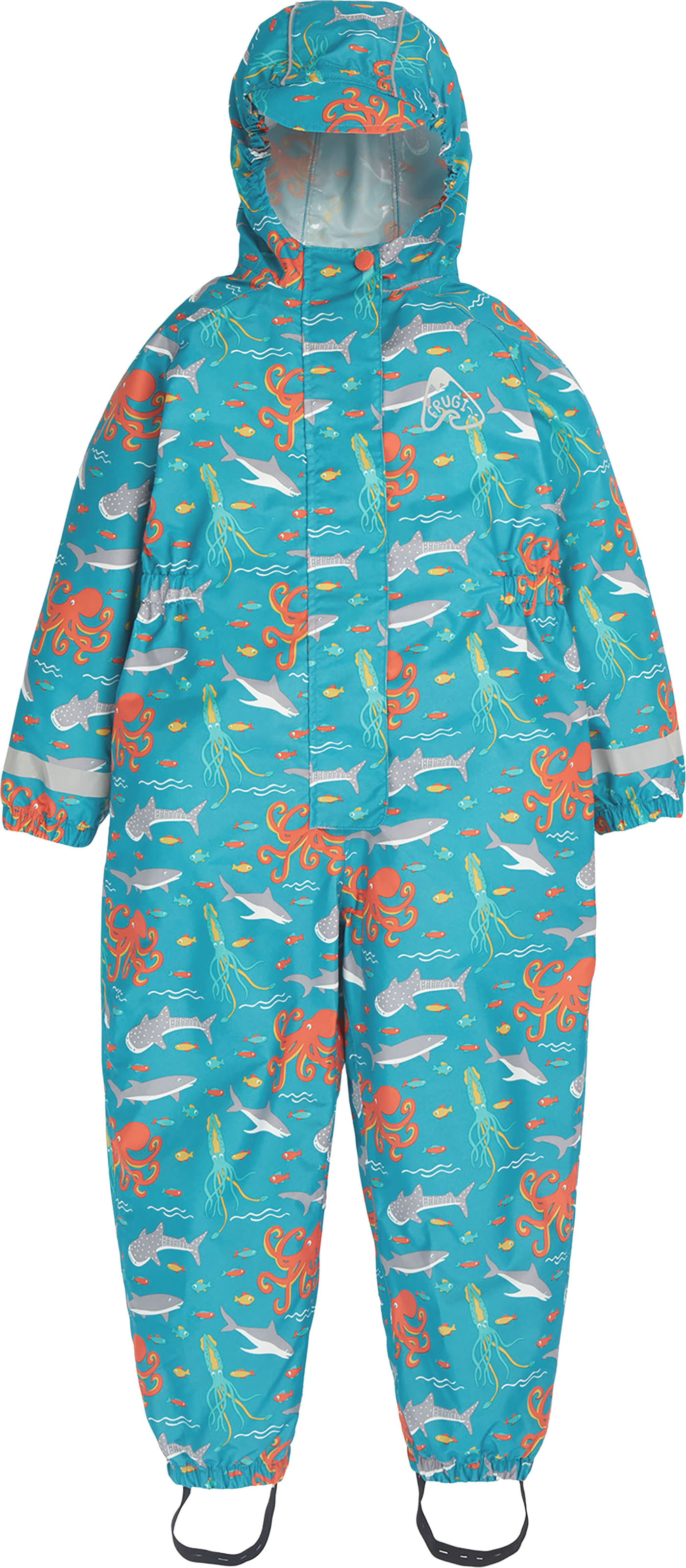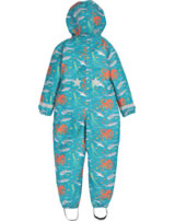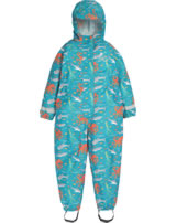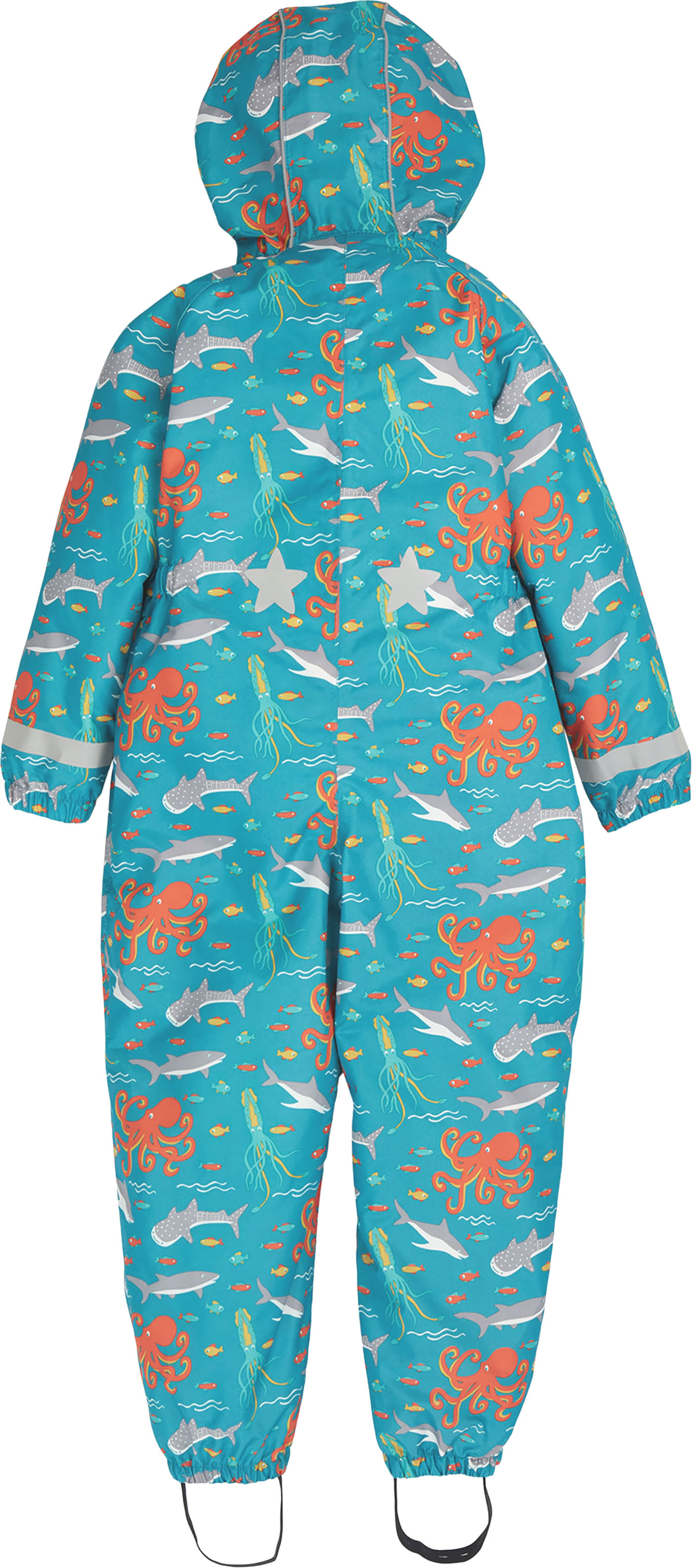 Regen-Overall mit Kapuze und tollen Unterwassermotiven von FRUGI. Der leichte Overall ist ideal, wenn es in Frühling oder Sommer regnet. Verschlossen wird der Overall mit einem Reißverschluss und Klettverschlüssen. Kapuze, Ärmelbündchen und Bein sind mit Gummibündchen ausgestattet, so dass Nässe und Kälte draussen bleiben müssen. Abnehmbare Fußstege verhindern ein Hochrutschen der Beine. Reflektierende Elemente sorgen für eine bessere Sichtbarkeit im Dunkeln.