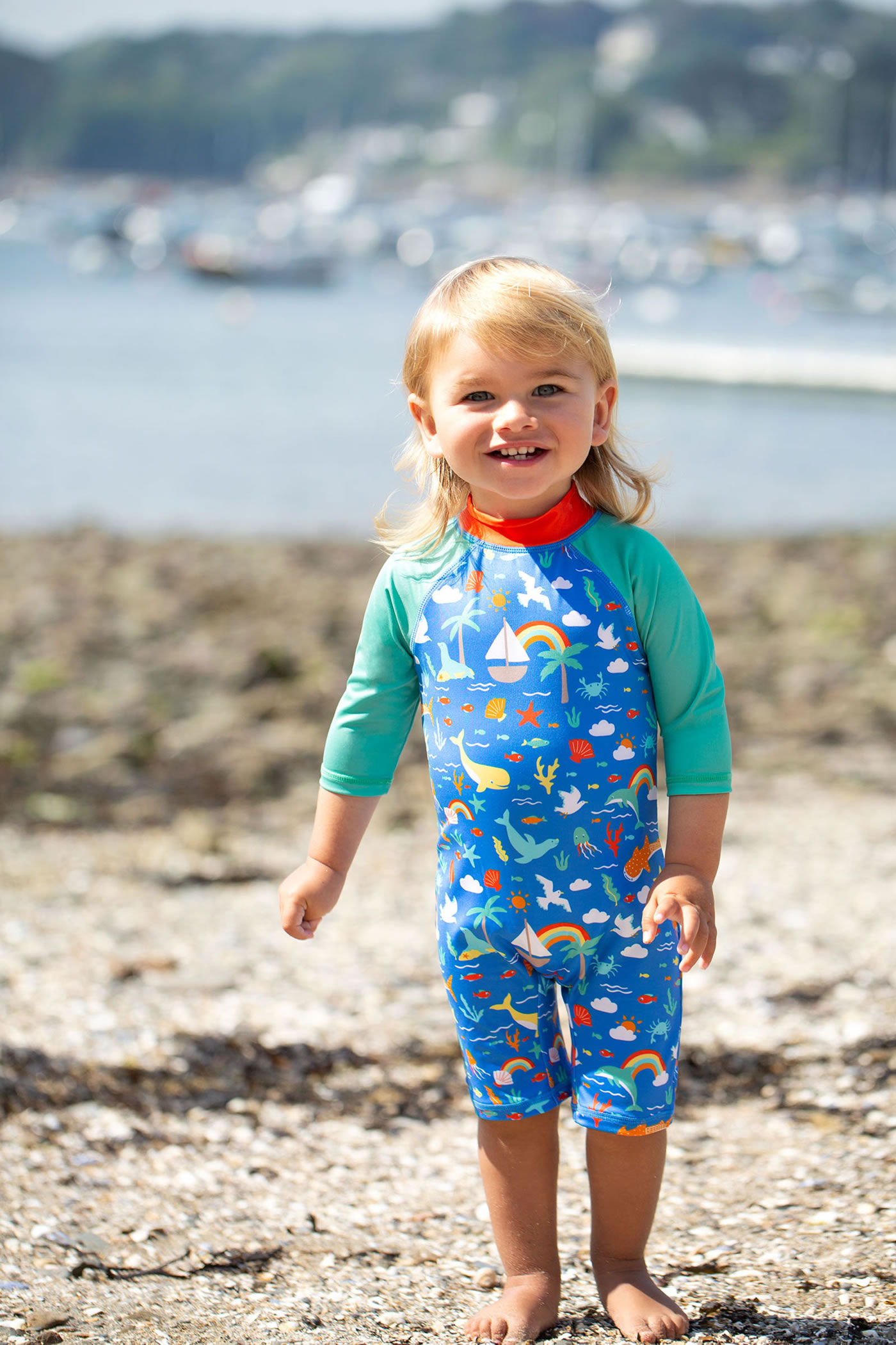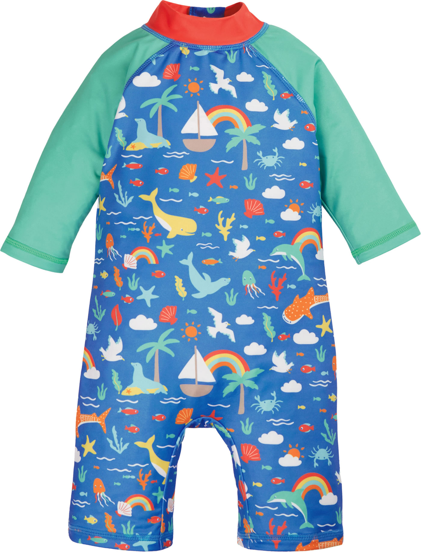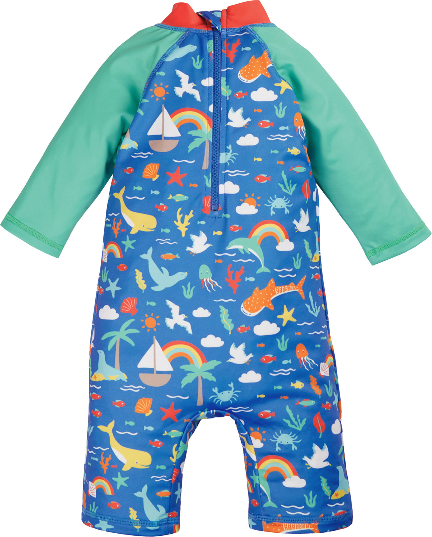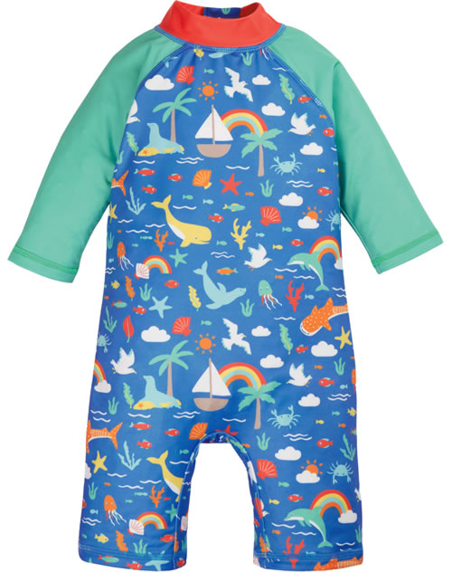 Dieser Schwimmanzug von FRUGI läßt die Kleinen Wasser und Strand sorgloser genießen. Der Overall bietet Schutz vor der Sonne und nach dem Baden ist er schnell wieder trocken. Der Reißverschluss befindet sich auf der Rückseite. Das farbenfrohe Muster und die bunten Meeresbewohner sind ein toller Hingucker.
