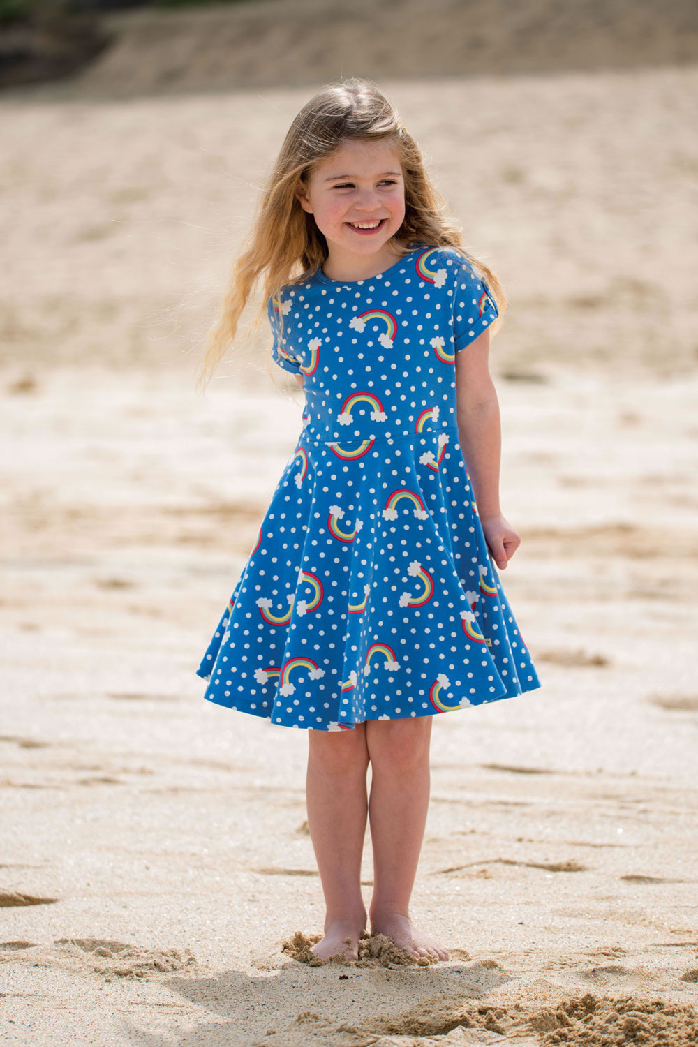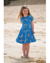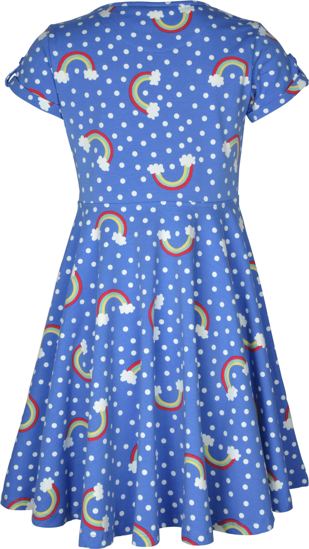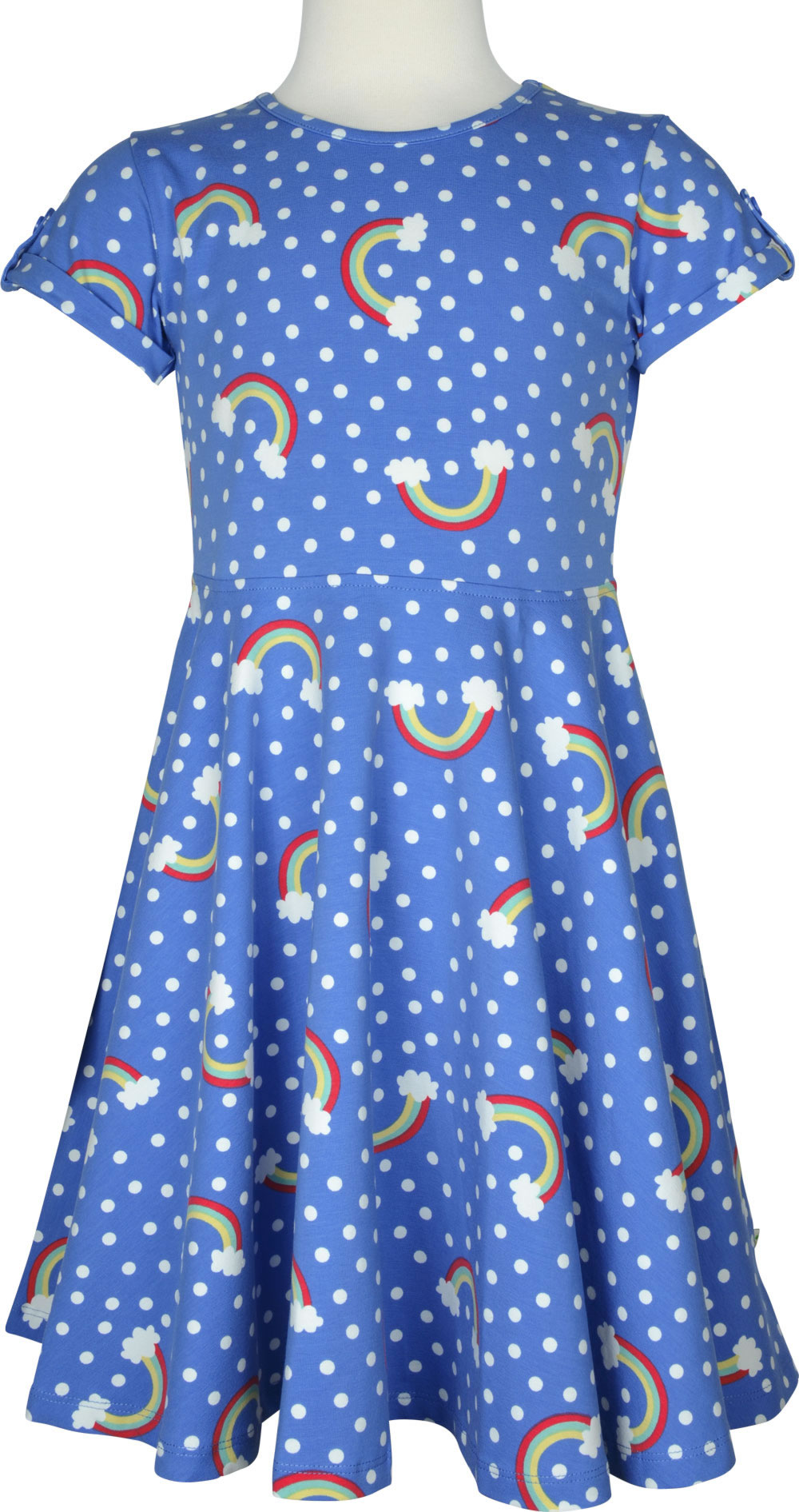 Hübsches Kurzarm-Kleid in blau mit weißen Punkten von FRUGI. Ein bezauberndes Detail ist der Regenbogen-Alloverprint. Der Umschlag an den Ärmeln ist zusätzlich mit einer Lasche und Knopf versehen. Das Jersey-Kleid hat einen weiten Tellerrock und wird somit sicher schnell zum Lieblingsstück. Für ein angenehmes Tragegefühl sorgt das Material aus 100 % organischer Baumwolle.