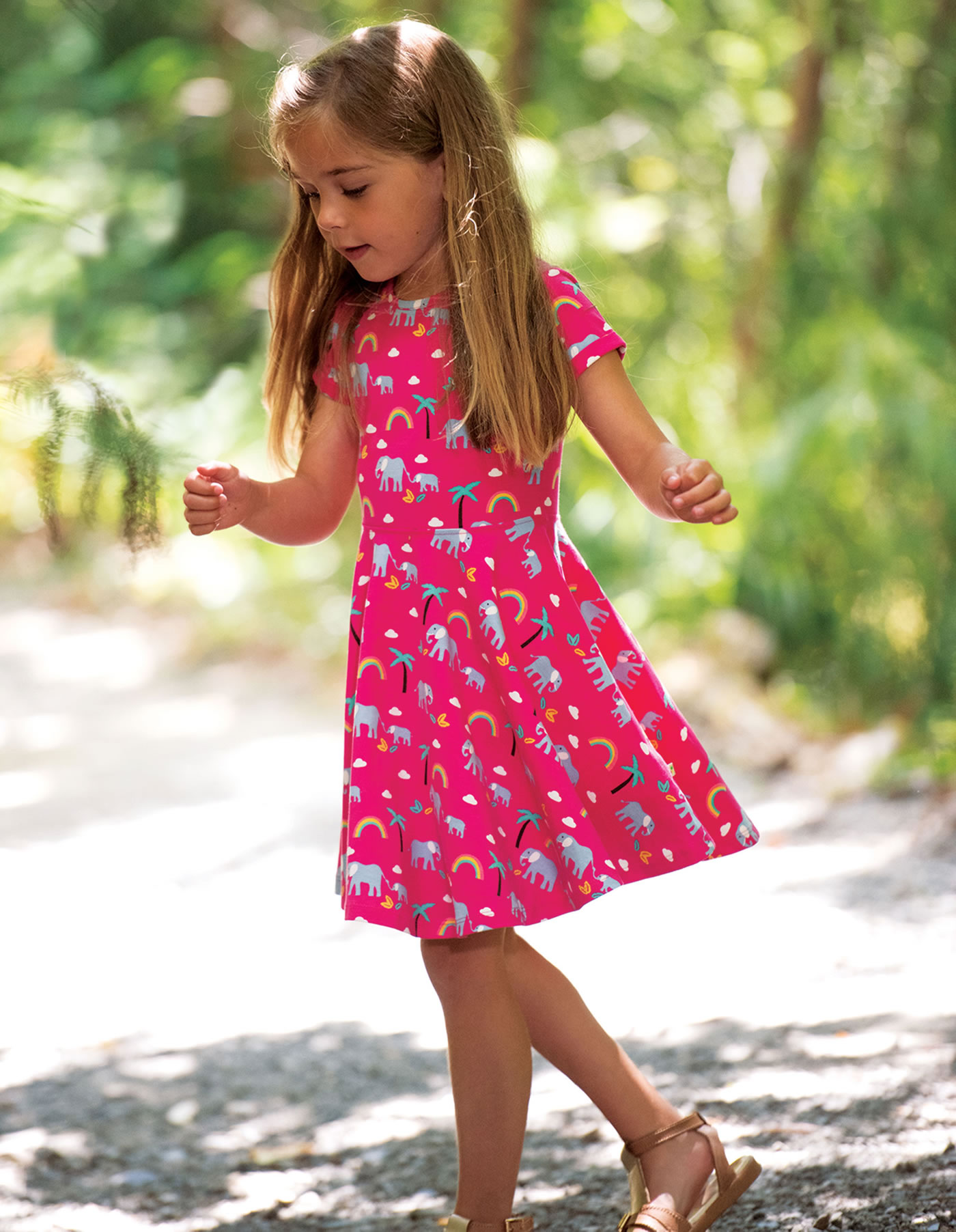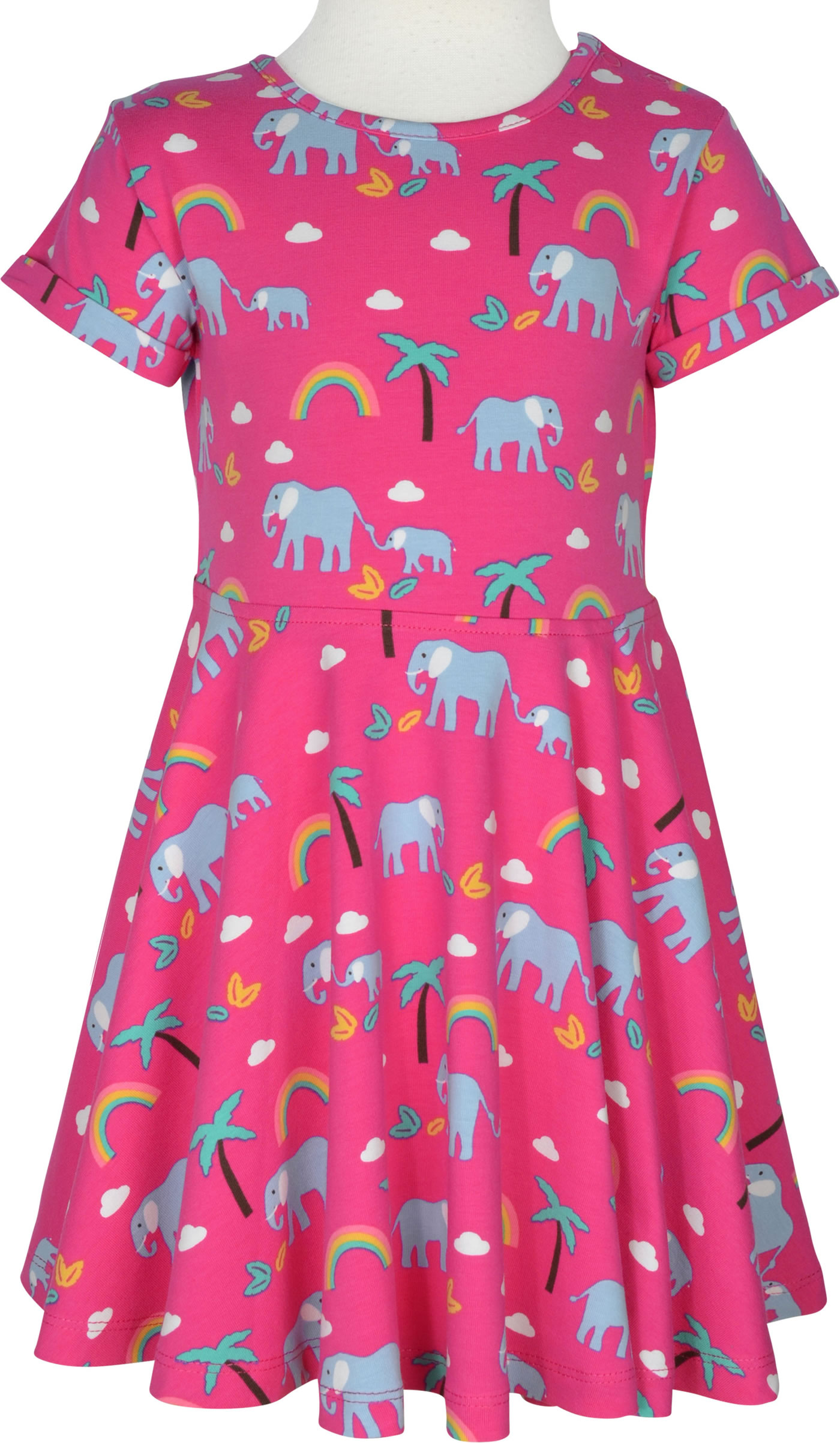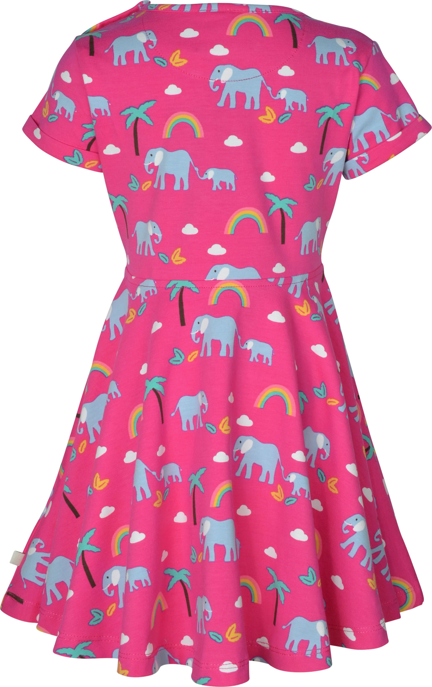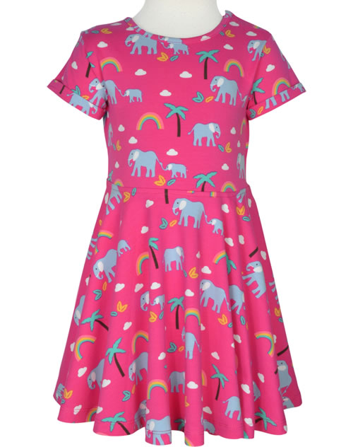 Hübsches Kurzarm-Kleid in pink mit tollen Elefanten und Regenbogen Motiven von FRUGI. Das Jersey-Kleid hat einen weiten Tellerrock und wird somit sicher schnell zum Lieblingsstück der Mädels. Für ein angenehmes Tragegefühl sorgt das Material aus organischer Baumwolle.