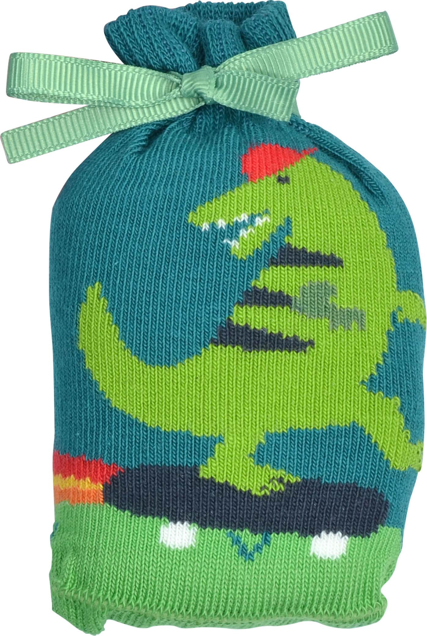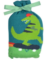 Hübsches Paar Socken von FRUGI mit tollem Dino-Motiv. Die Socken sind in einem kleinen Strickbeutel verpackt. So sind sie ein perfektes Geschenk.