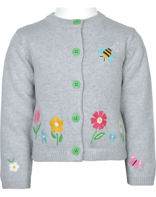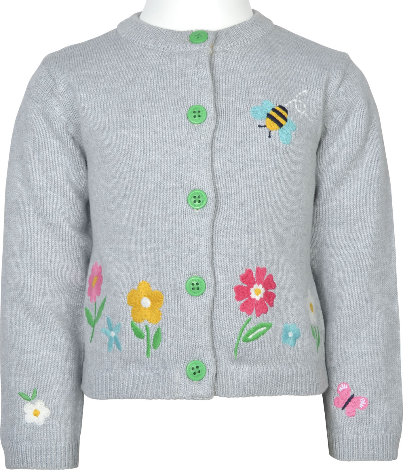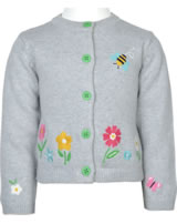 Hübsche Strickjacke für Mädchen von FRUGI. Die Strickjacke wird mit grünen Knöpfen verschlossen und ist kurz geschnitten. Schöne Details sind die Stickereien mit Blumen, Biene und Schmetterling auf Vorderseite und Ärmeln. Das weiche Material aus organischer Baumwolle sorgt für einen hohen Tragekomfort.