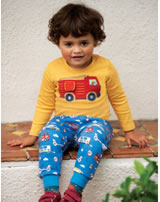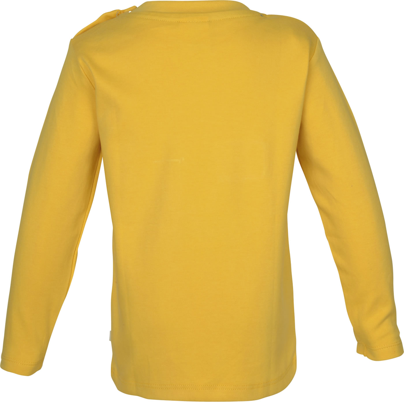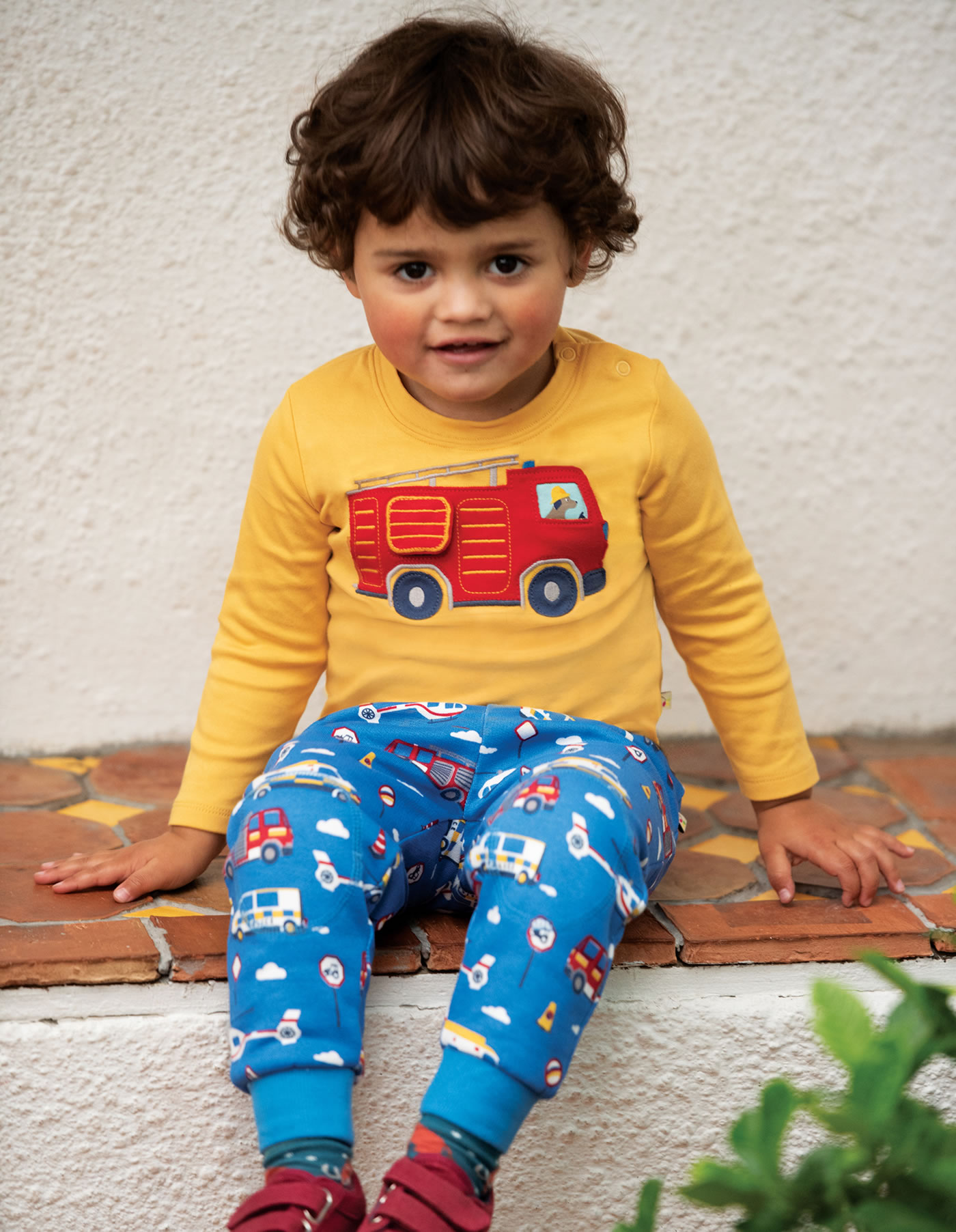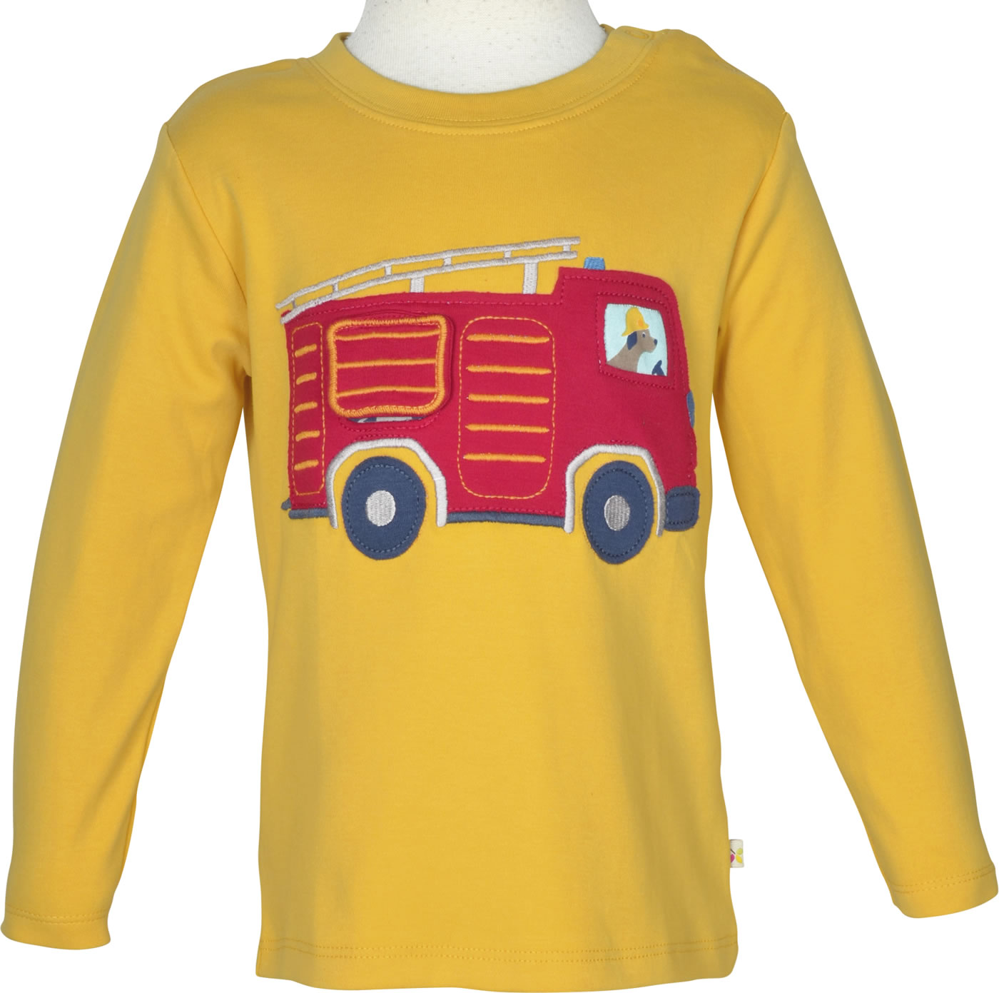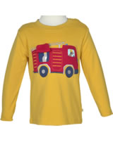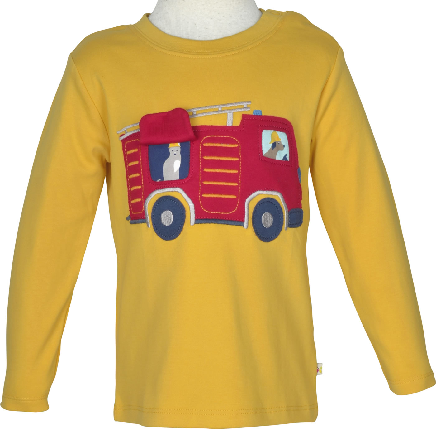 Gelbes Langarm-Shirt für Jungen mit interaktiver Feuerwehr-Applikation auf der Vorderseite von FRUGI. Die kleine Knopfleiste am Halsausschnitt erleichtert das An- und Ausziehen. Das weiche Material aus organischer Baumwolle fühlt sich angenehm auf der Haut an.