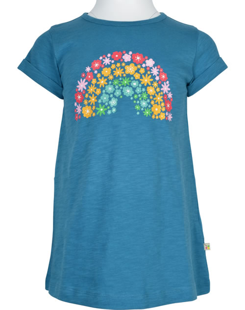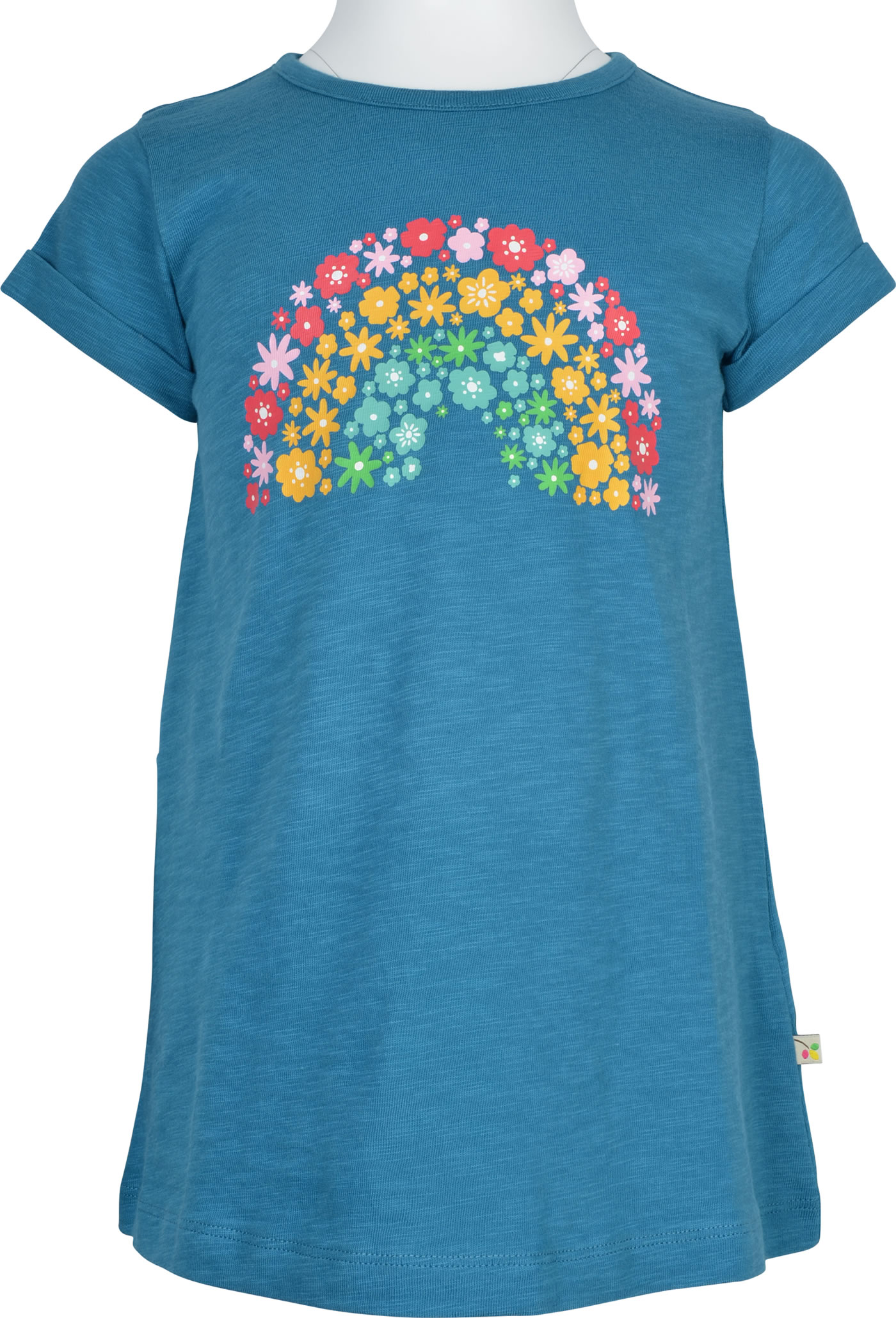In A-Linie geschnittenes Kurzarm-Shirt im Tunika-Style aus organischer Baumwolle von FRUGI. Das farbenfrohe Lieblings-Shirt lässt sich prima kombinieren. Die drei Knöpfchen am Rücken helfen beim An- und Ausziehen. Ein toller Hingucker ist der bunte Blumen-Regenbogen.