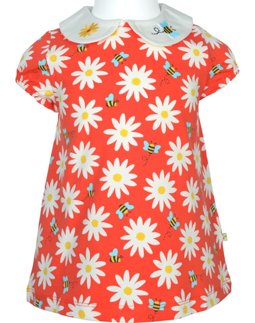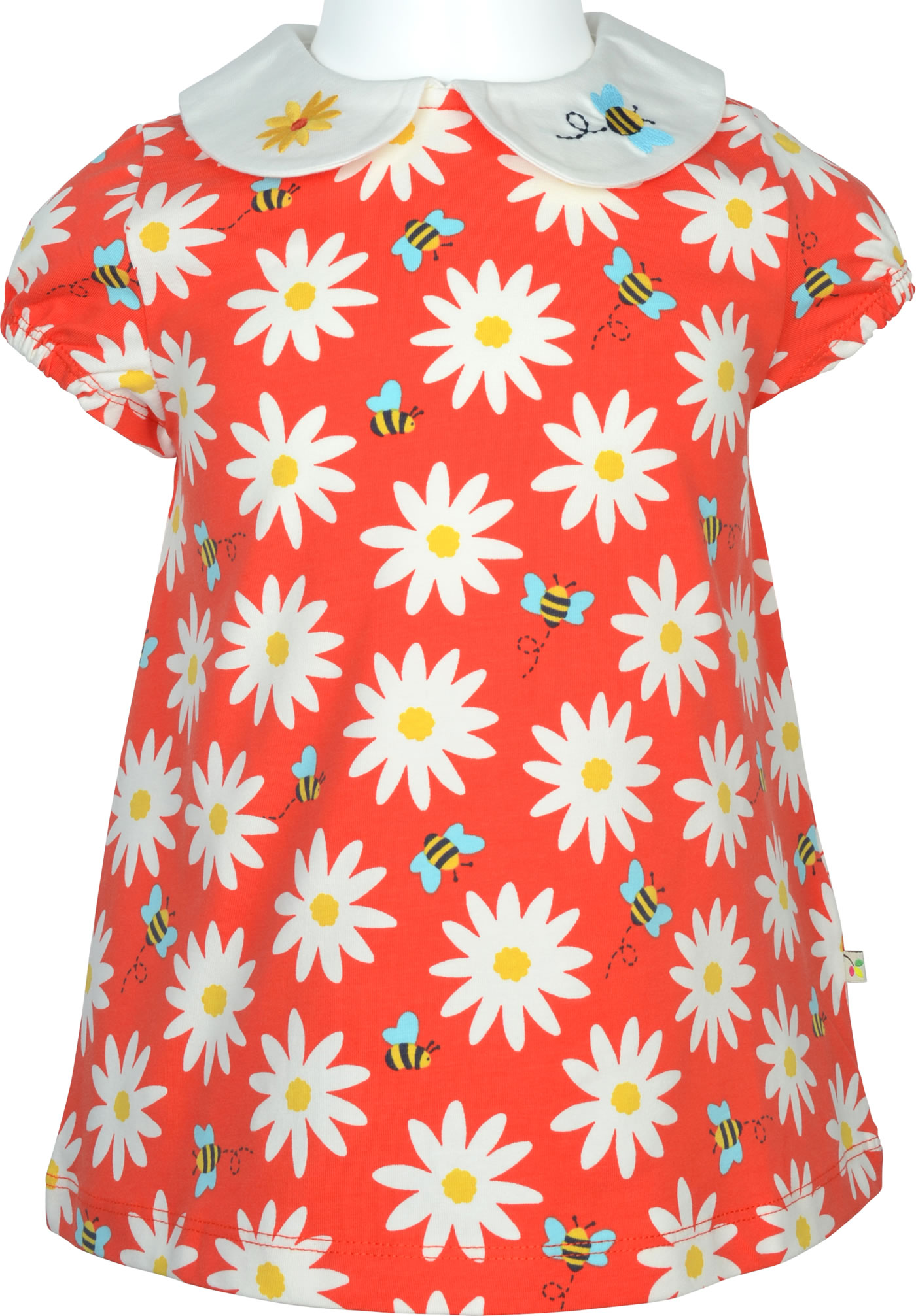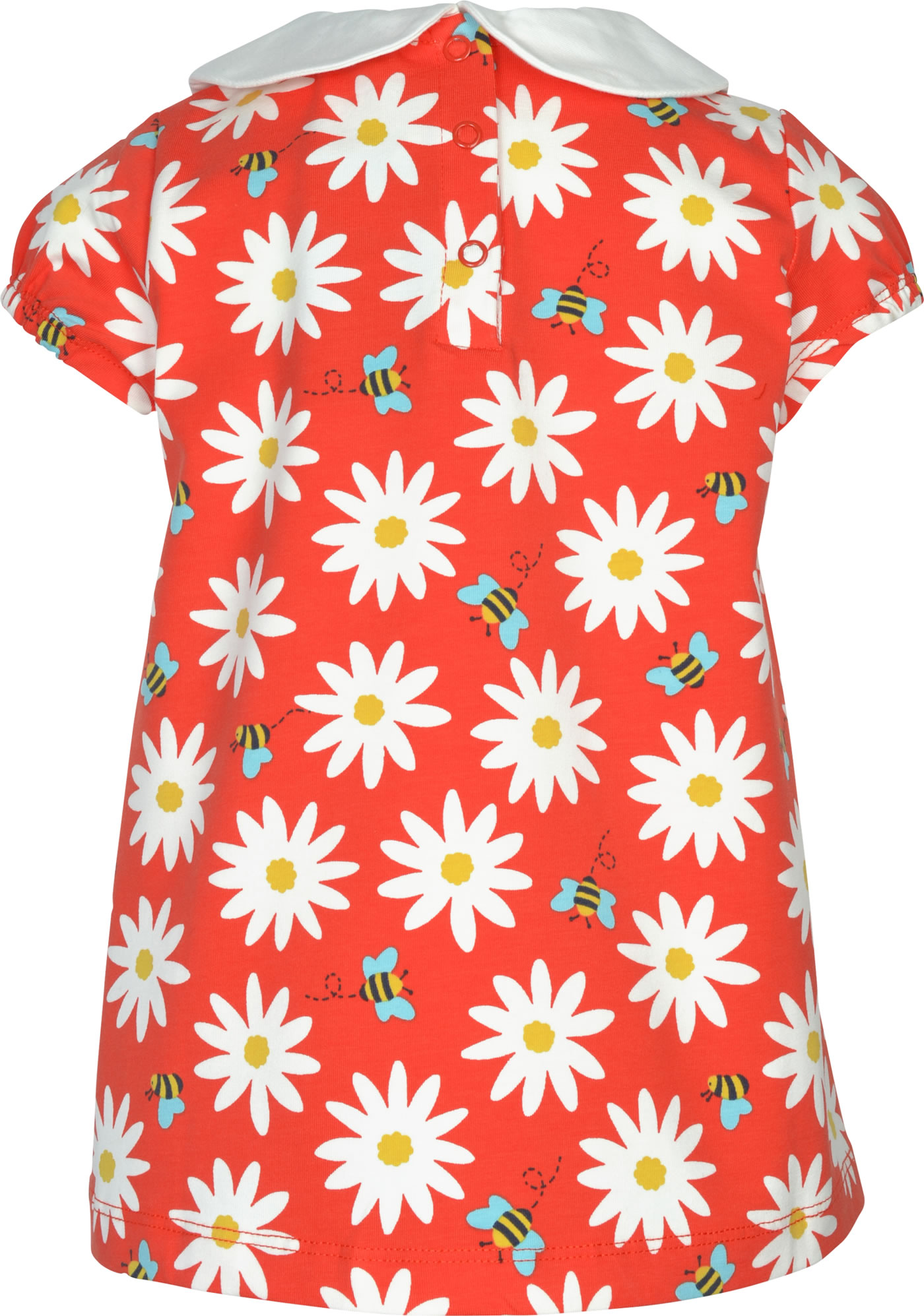 Kurzarm-Shirt in A-Linie aus organischer Baumwolle von FRUGI. Das farbenfrohe Lieblings-Shirt lässt sich prima kombinieren. Die drei Druckknöpfe auf der Rückseite helfen beim An- und Ausziehen. Schöne Details sind die gerafften Ärmel und die Stickapplikationen mit Biene und Blume auf dem Kragen.