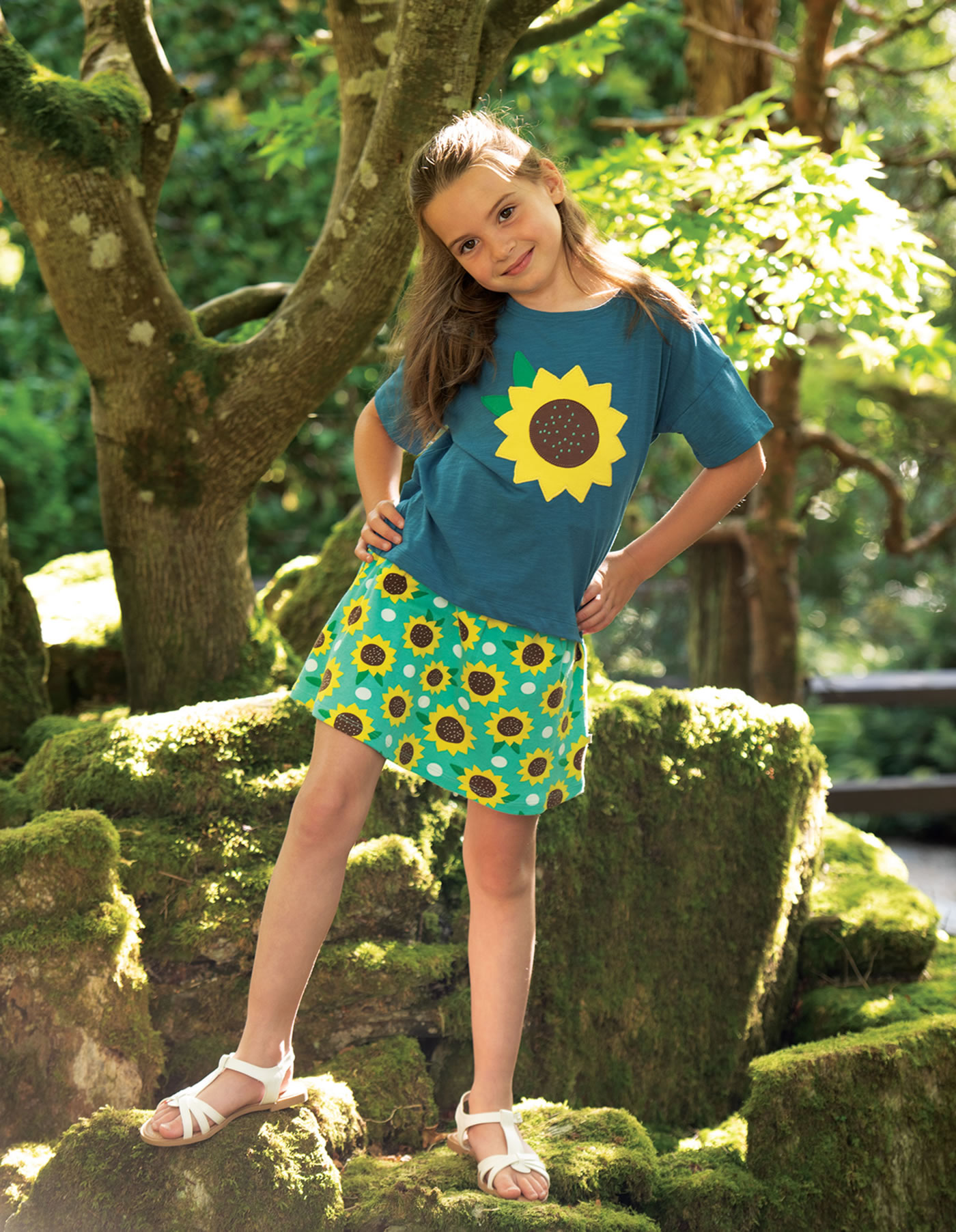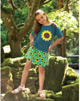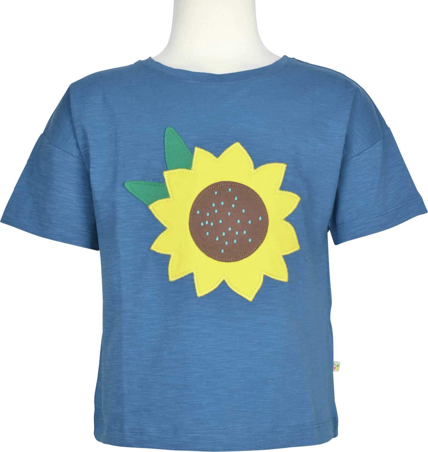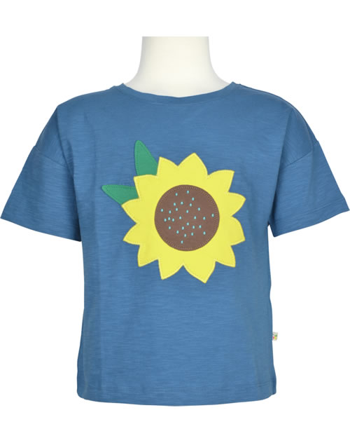 Tolles Kurzarm Shirt für Mädchen in blau von FRUGI. Die Sonnenblumen-Applikation auf der Vorderseite ist ein absoluter Blickfang.